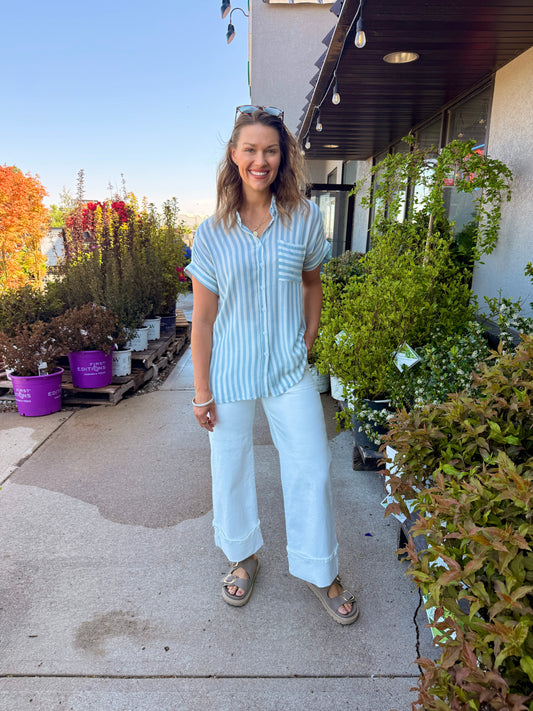 Striped Short Sleeve Button-Down Shirt with Rolled Cuffs
