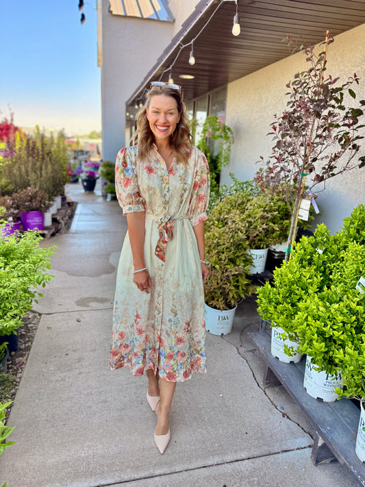 Botanical Print Puff Sleeve Midi Dress - Rosey