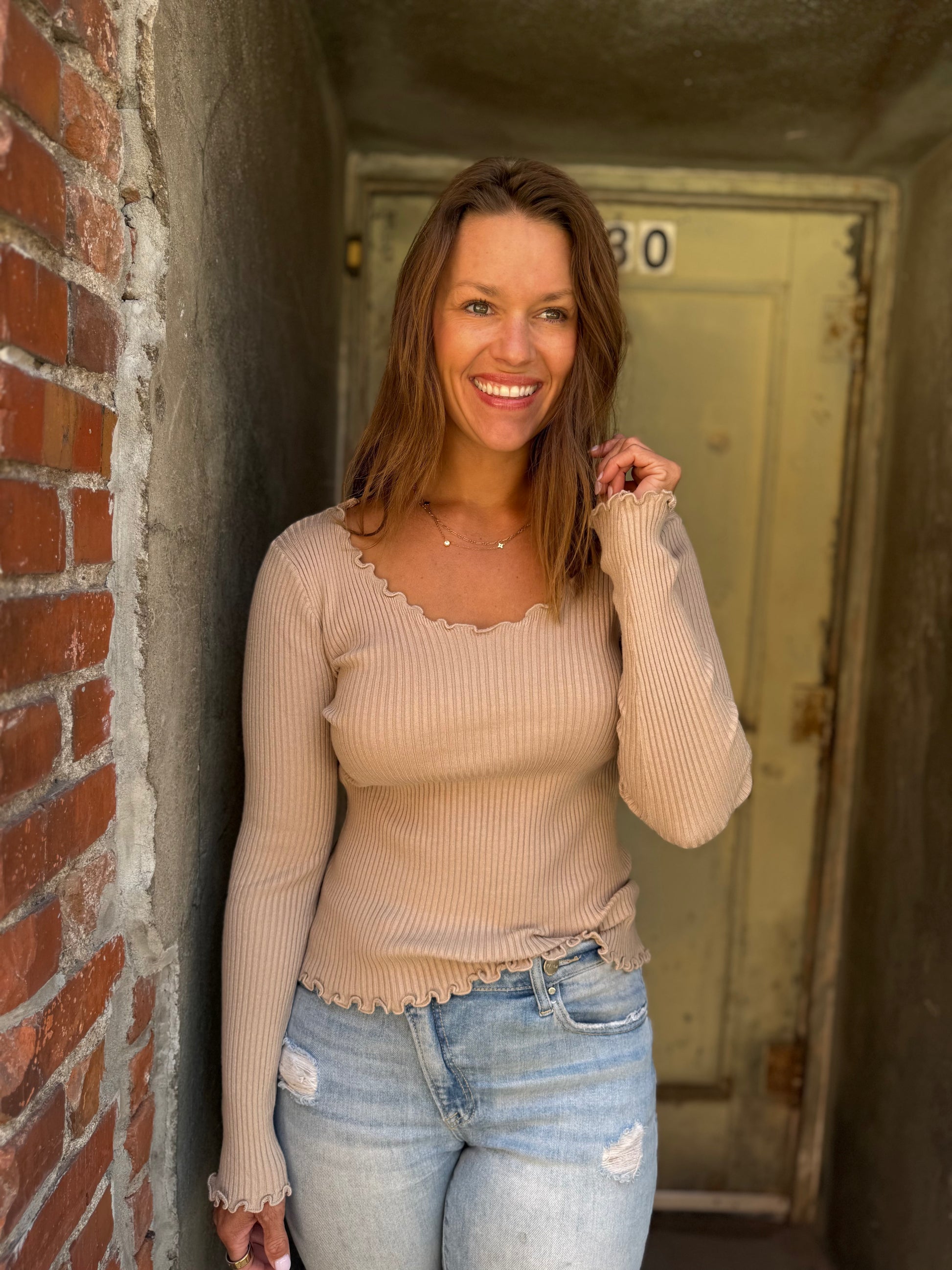 Model Fit: Kim is 5'7" and prefers a medium in both tops and bottoms and is modeling a medium in the Tan.