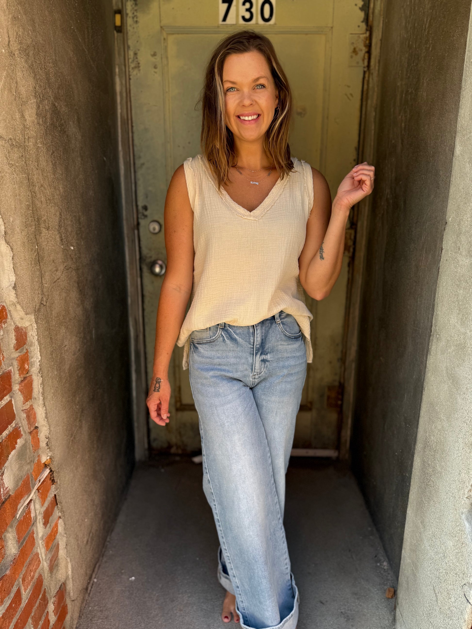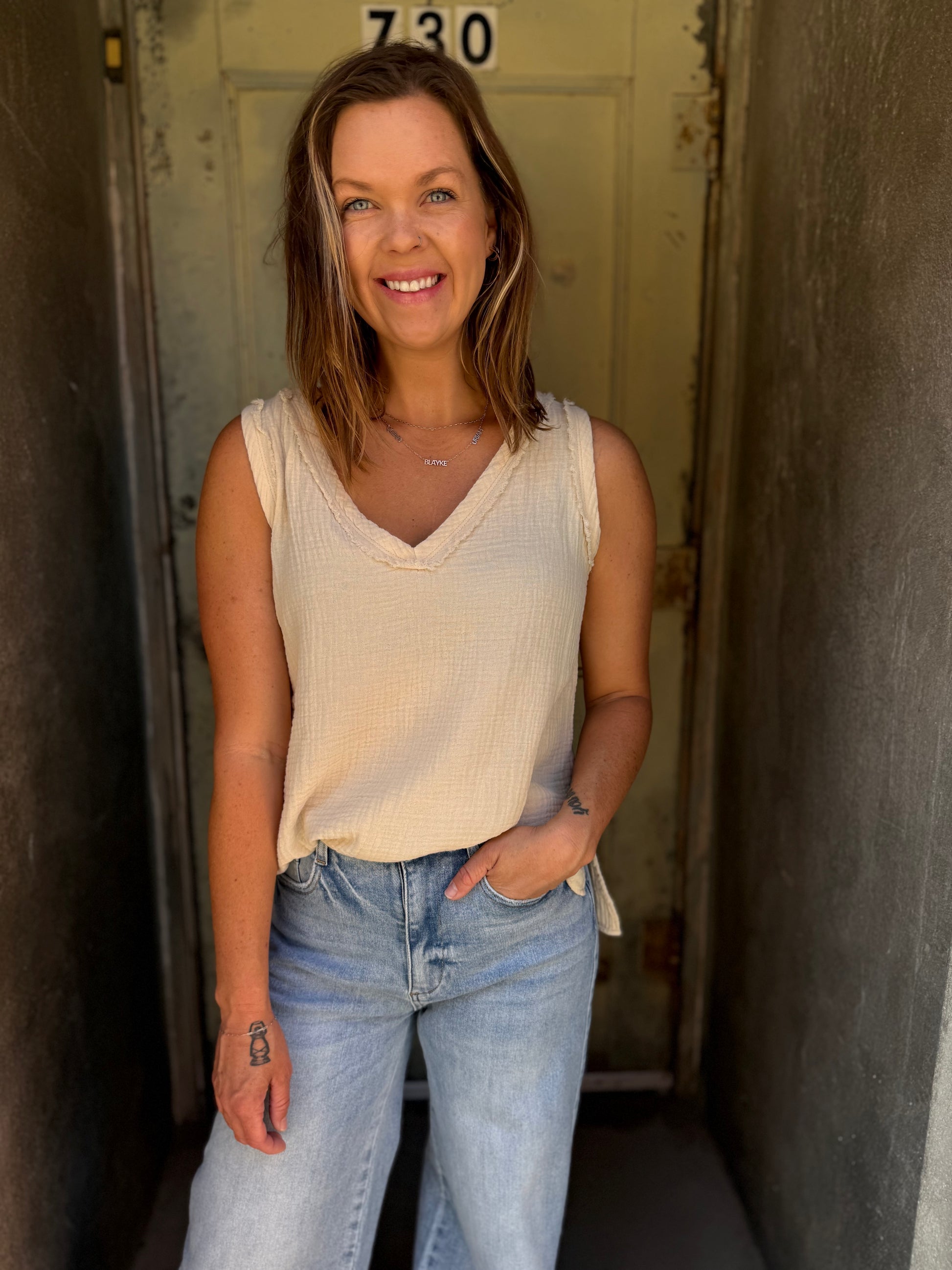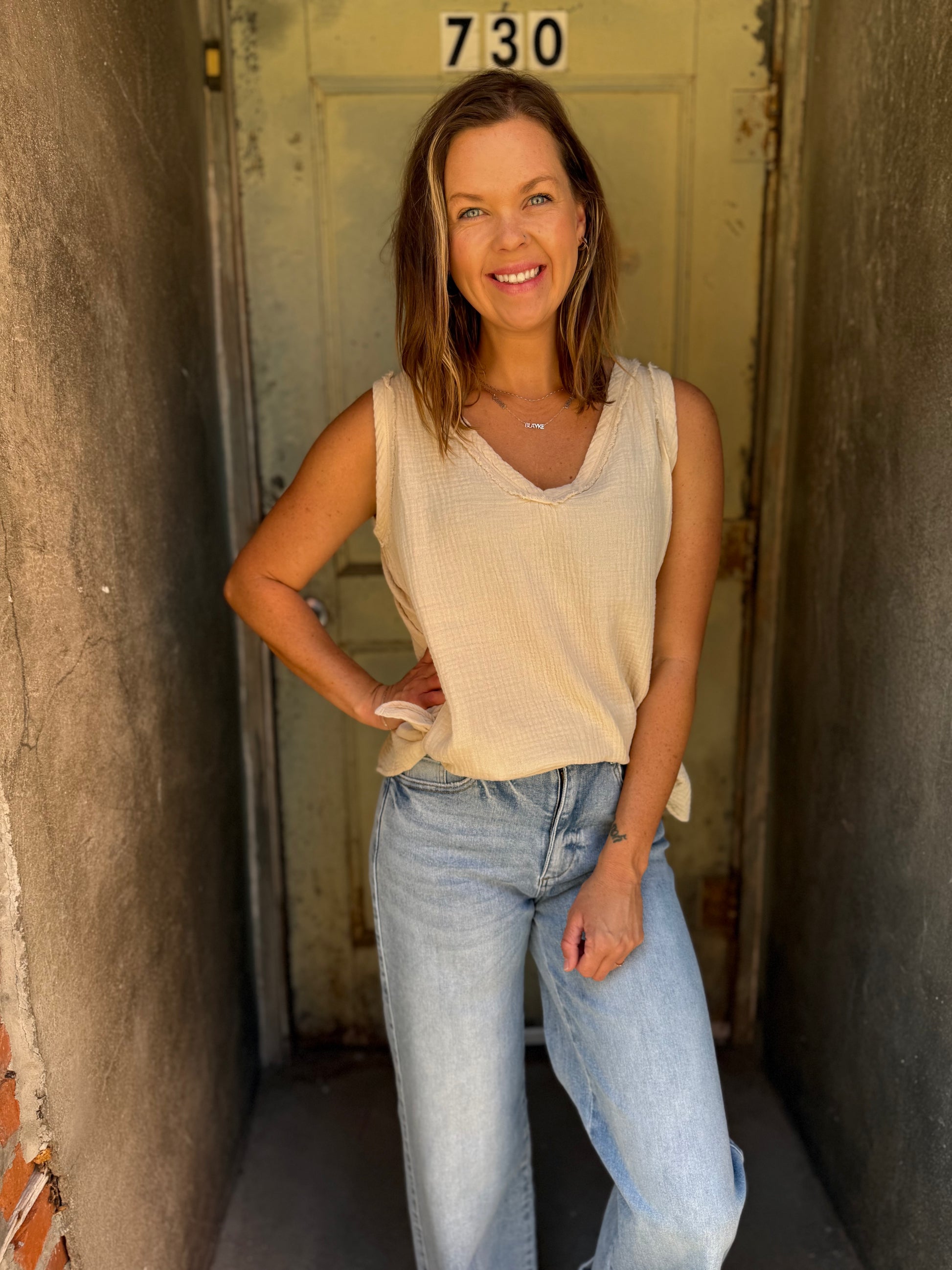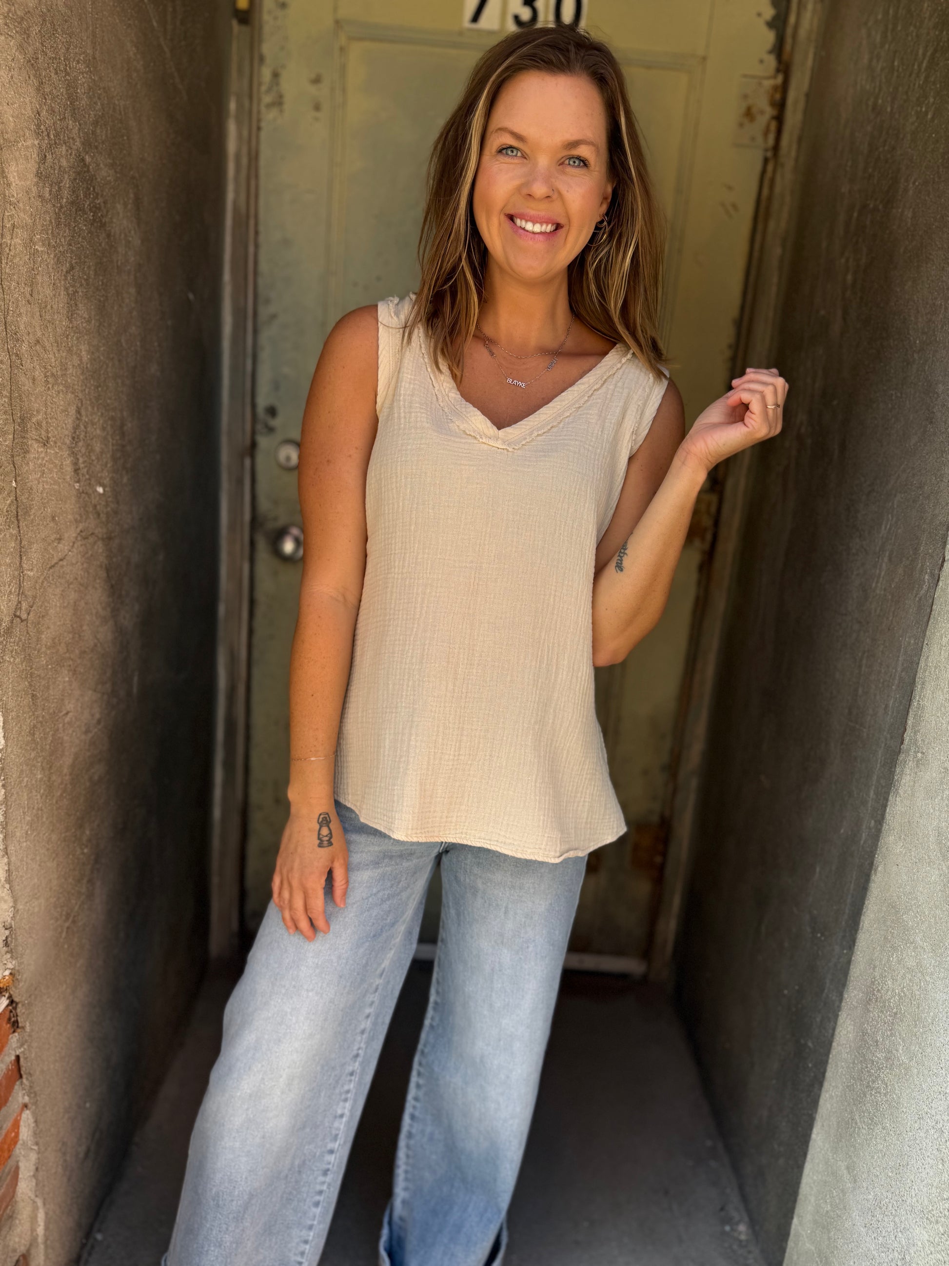 Breezy, effortless, and made for layering — the Nasia Tank is your wardrobe’s secret weapon. Crafted from our favorite lightweight cotton gauze, it features a flattering v-neckline and raw-edge detailing for that perfectly undone charm. Wear it solo on sunlit afternoons or layer it under a cardigan when the air turns crisp.