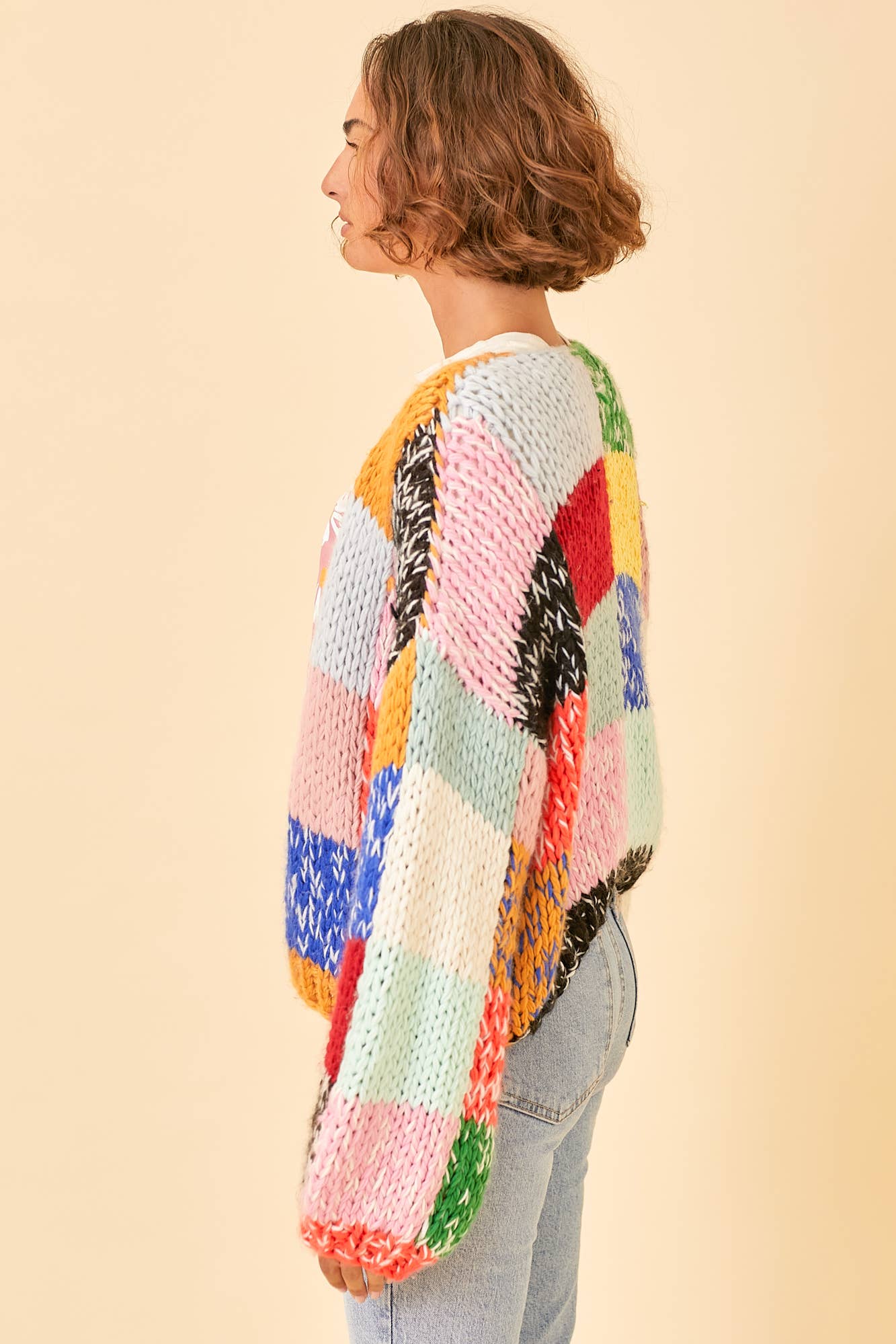 Get cozy and stylish with our Very Vintage Cardigan Sweater. This cardigan is a little oversized, providing the perfect combination of comfort and style. The colorblock design adds a fun touch to any outfit. (Model wearing small.)