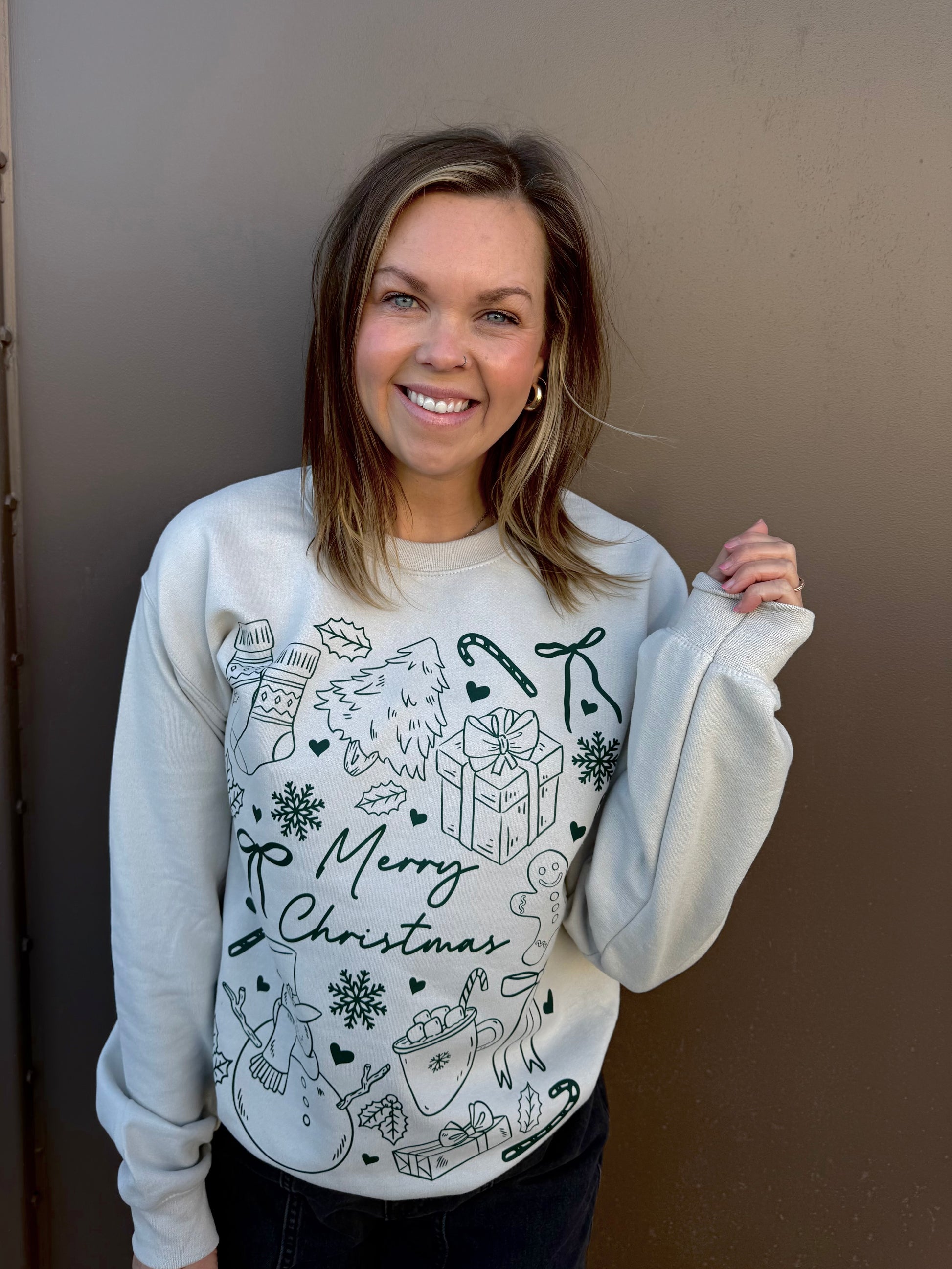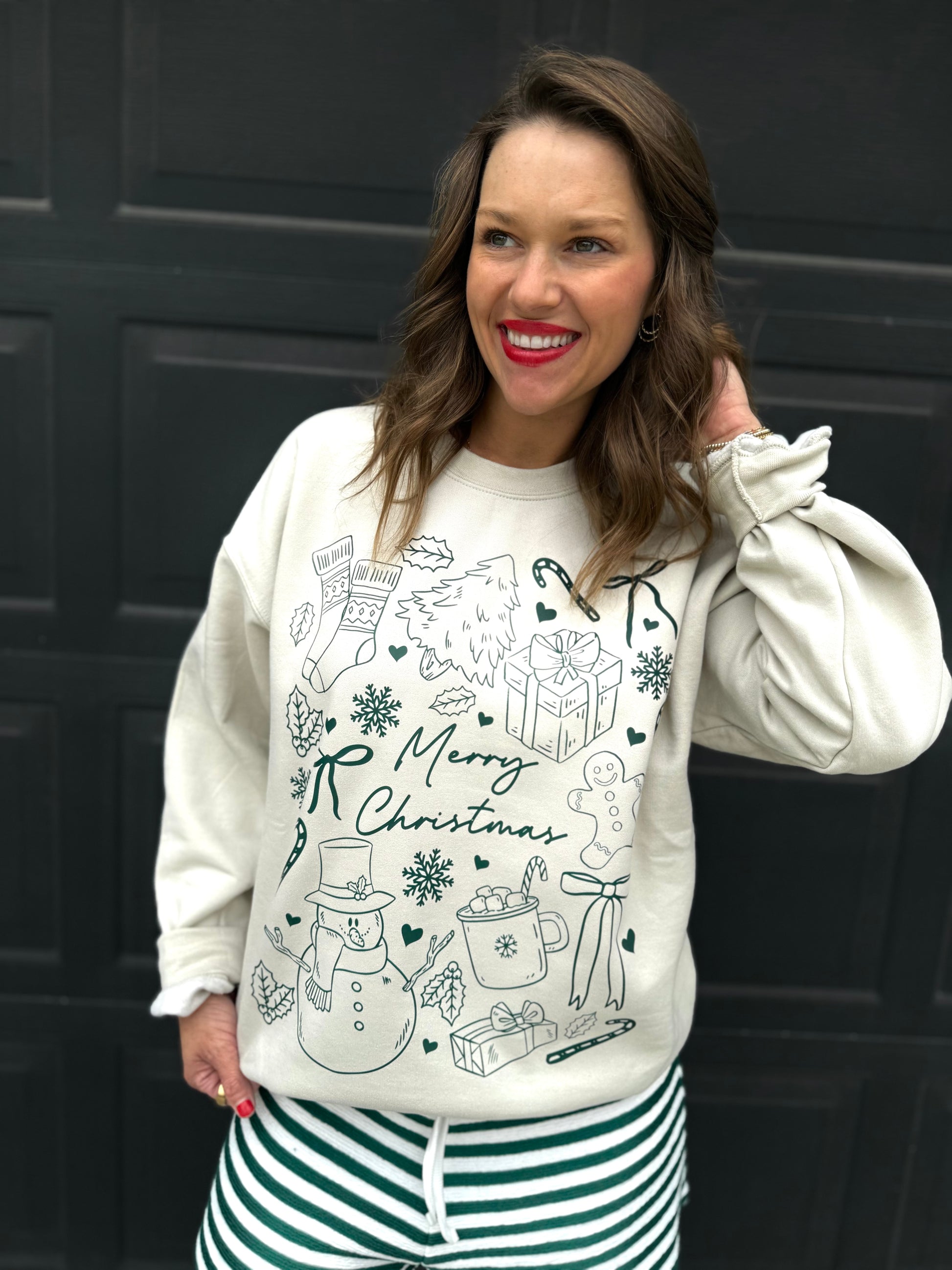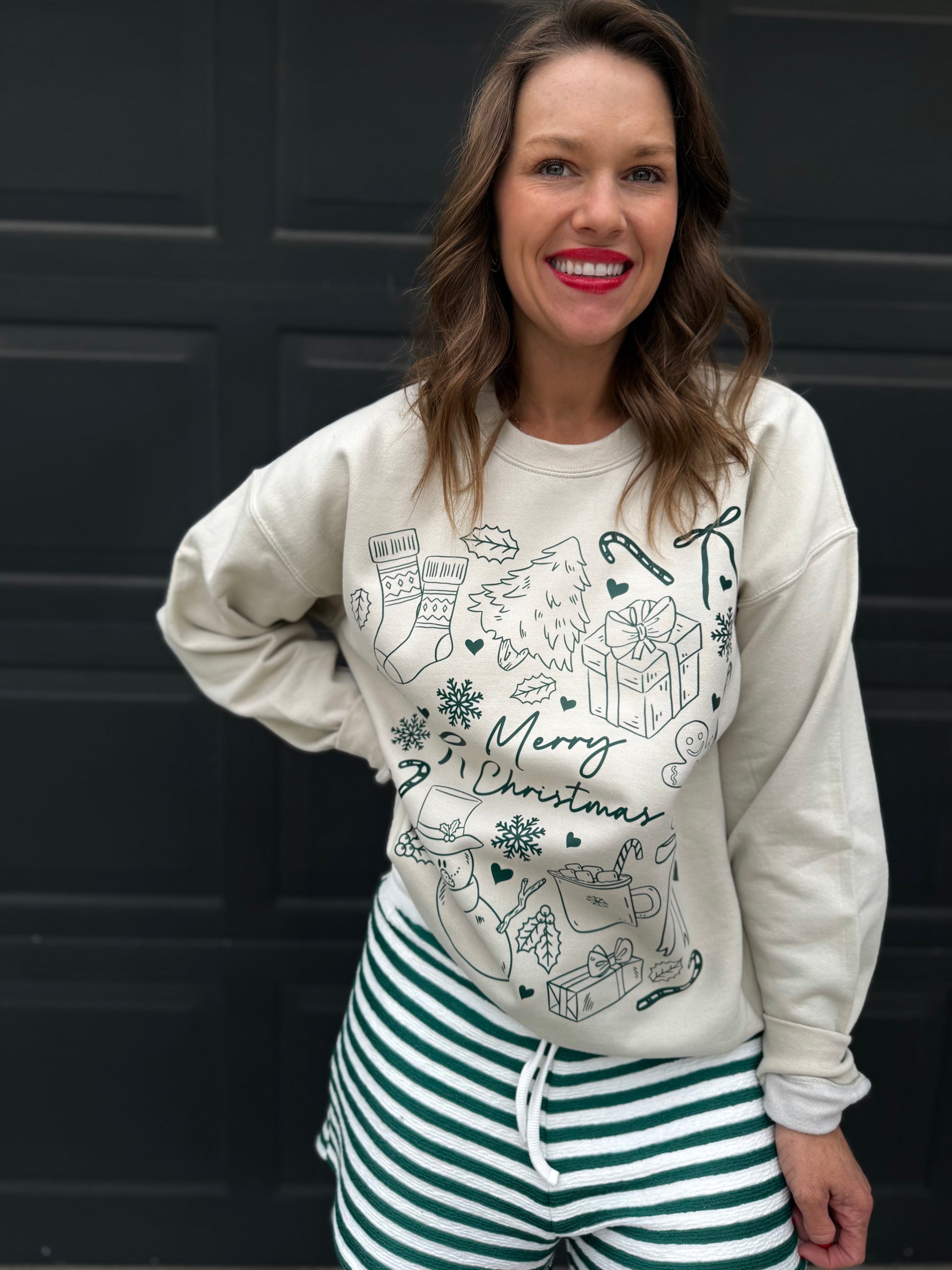 Get festive with the Christmas Doodle crewneck. This fun graphic top will add a touch of holiday spirit to any outfit. Designed in a neutral sand color, it's perfect for all your holiday festivities. Fits true to size, or size up for an oversized and playful look.