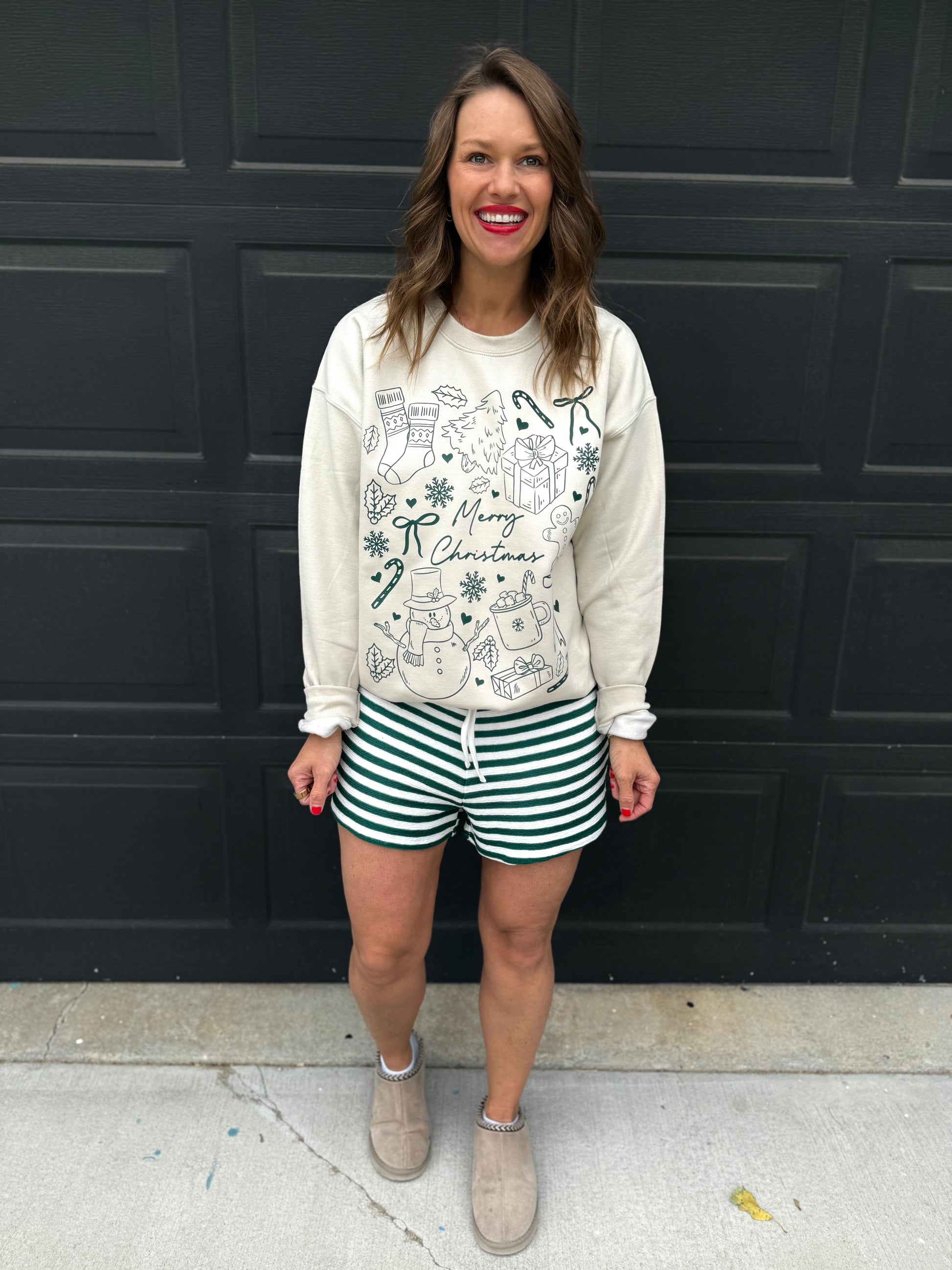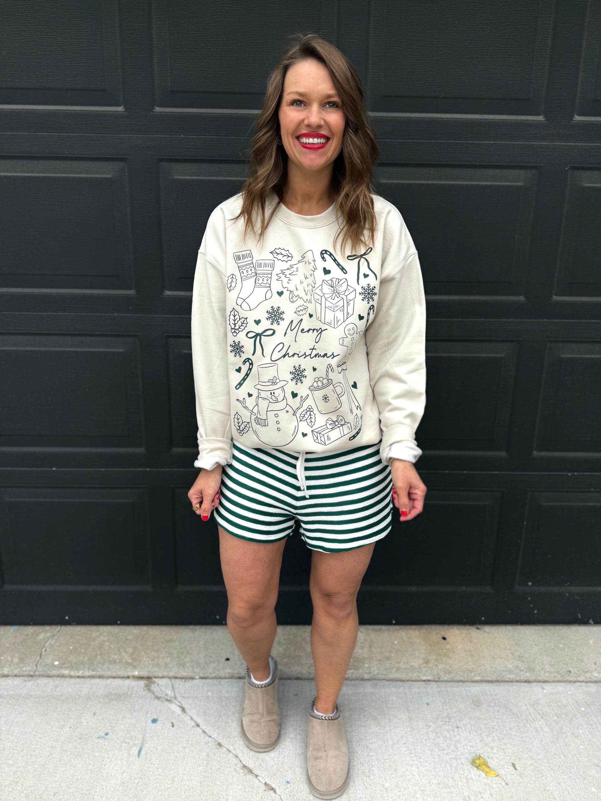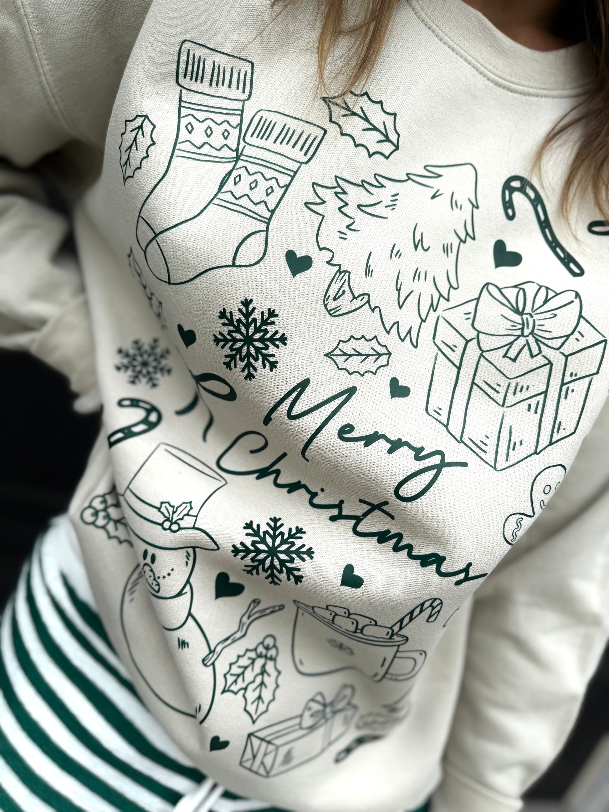 Get festive with the Christmas Doodle crewneck. This fun graphic top will add a touch of holiday spirit to any outfit. Designed in a neutral sand color, it's perfect for all your holiday festivities. Fits true to size, or size up for an oversized and playful look.