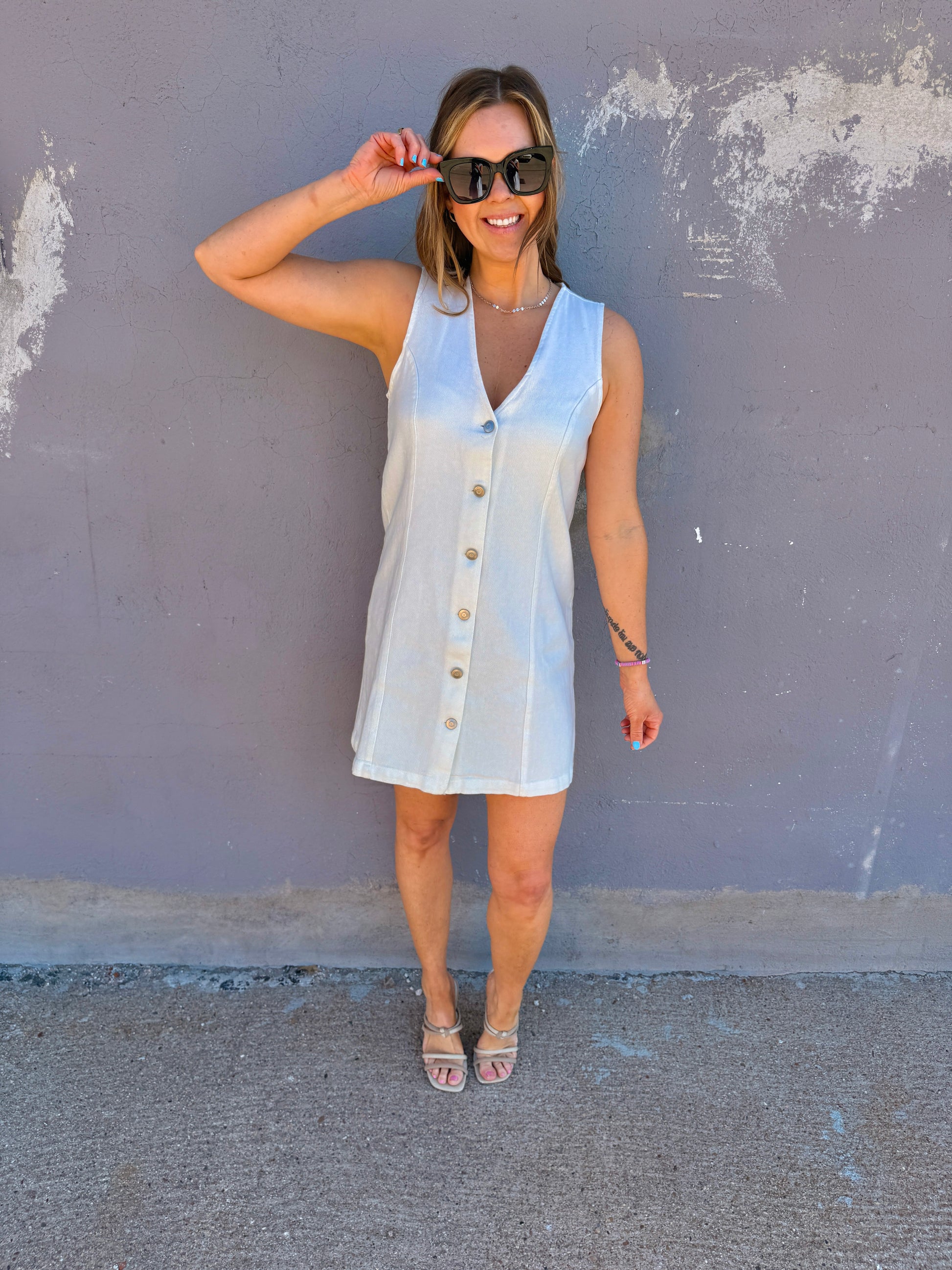 Effortlessly polished with everyday versatility, the City Classic Denim Dress is a timeless staple you’ll reach for season after season. Designed with a flattering V-neckline and full front button closure, this sleeveless silhouette creates a clean, streamlined look that’s easy to style up or down. A regular garment wash enhances the denim’s natural texture, giving it that perfectly broken-in feel.