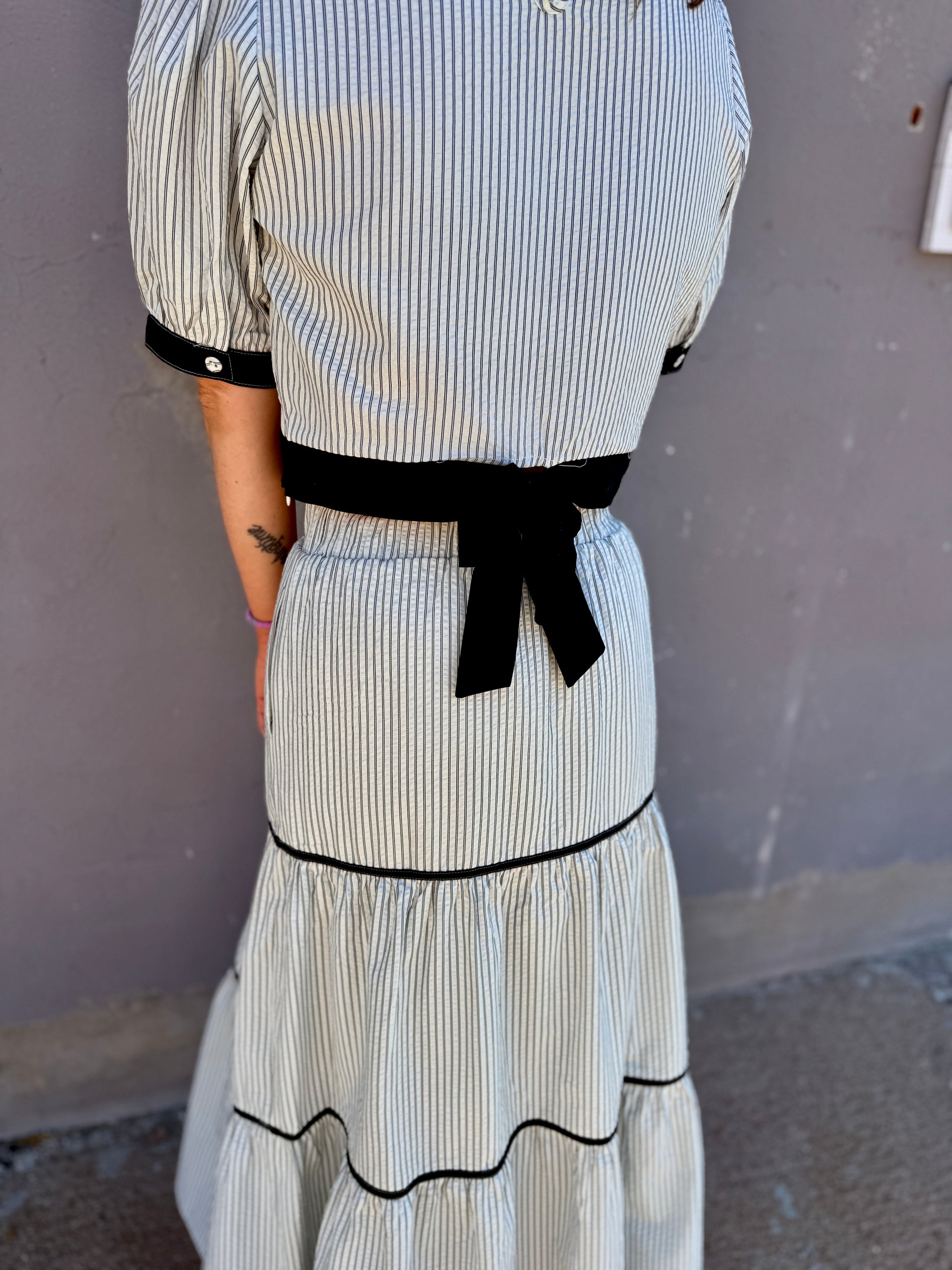 The tie-back detail adds a contemporary touch and allows for adjustable styling, while the crisp woven fabric provides a structured yet comfortable fit. Finished with a timeless vertical stripe pattern, this piece blends style and practicality perfectly.