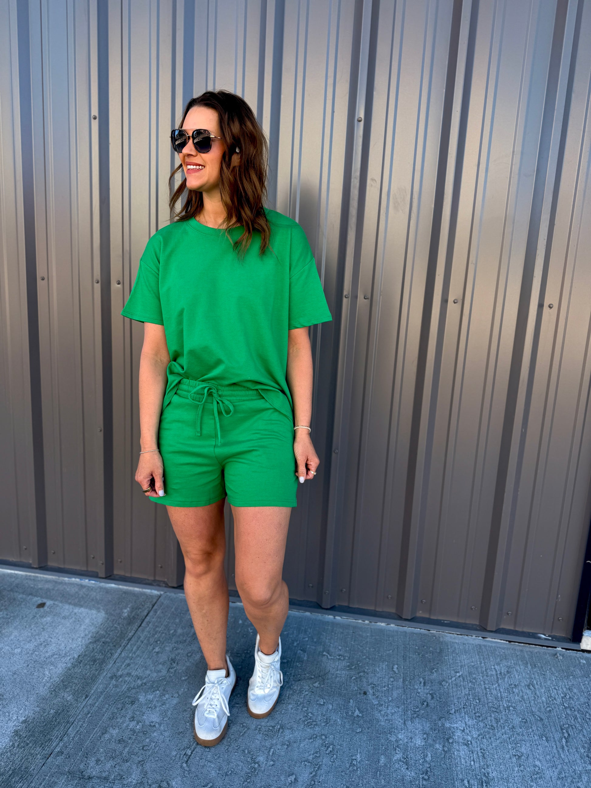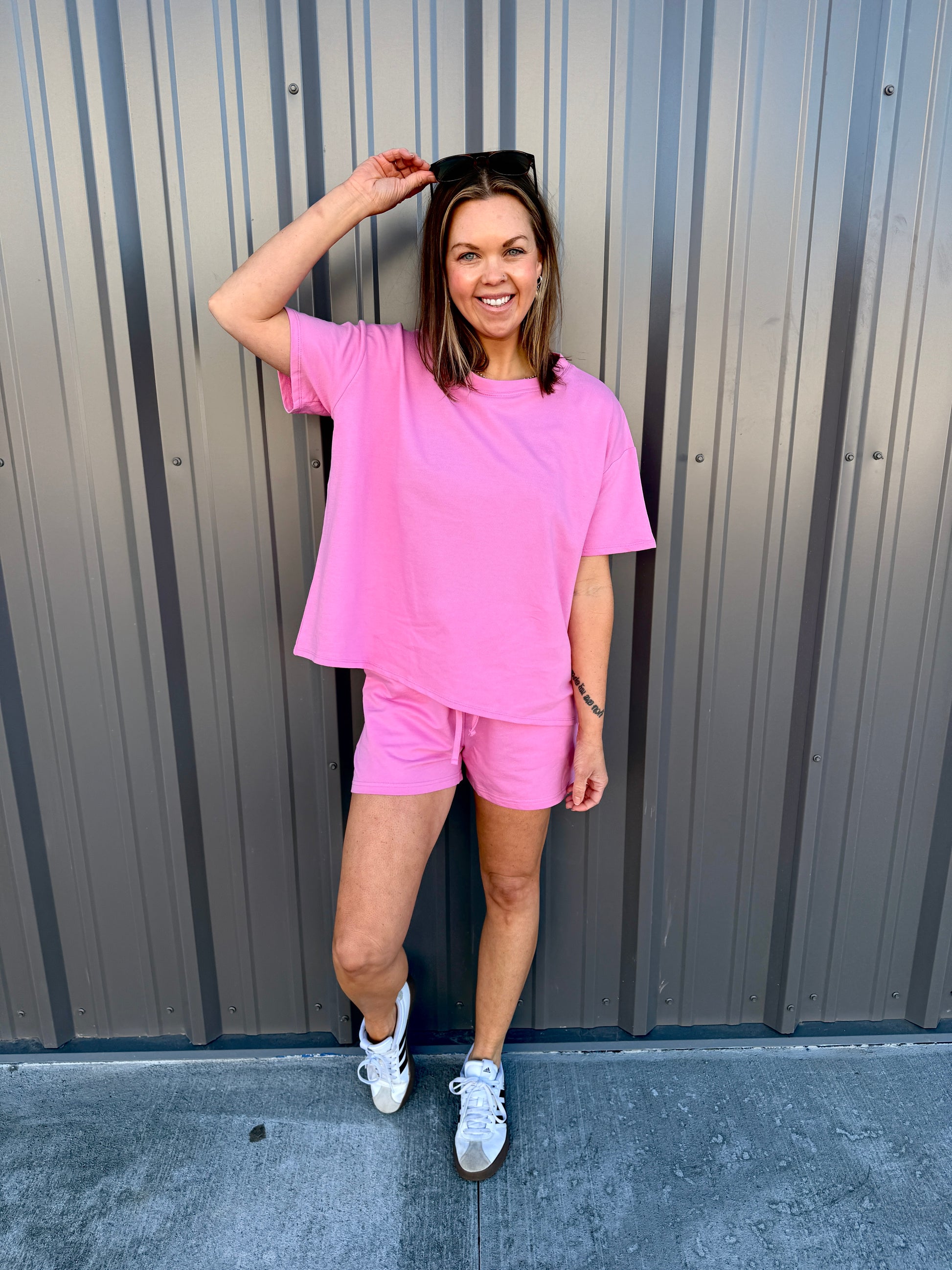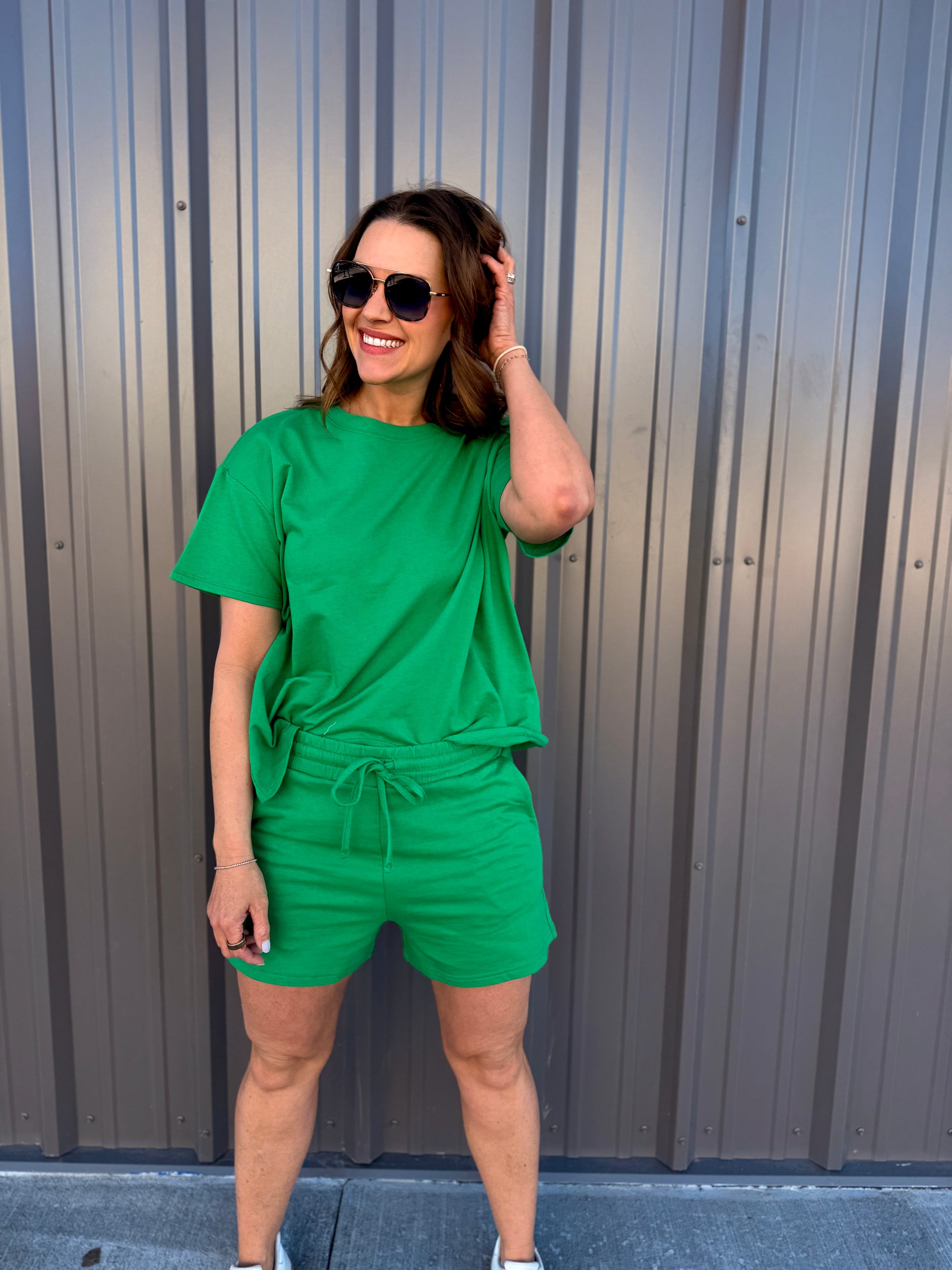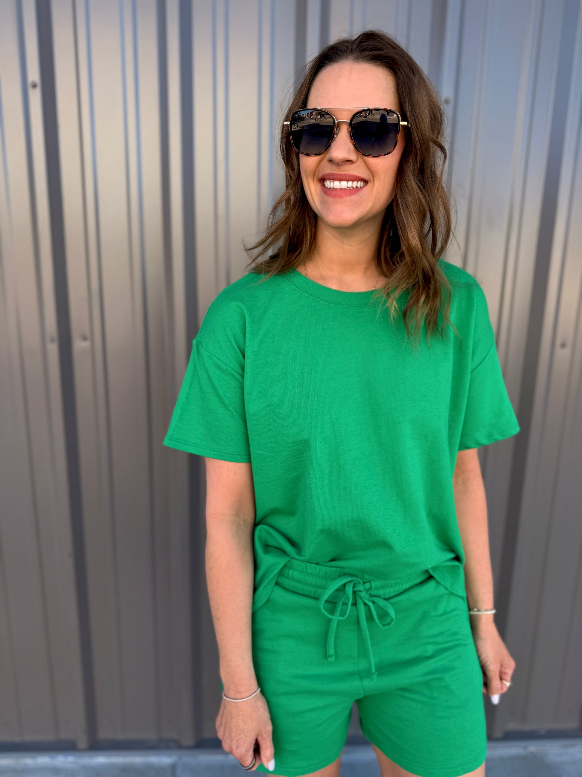 Effortless comfort meets everyday style with this French terry two-piece. The short-sleeve, round-neck top features a relaxed, oversized fit, while the matching shorts include a comfortable elastic waist and functional pockets. Perfect for lounging, errands, or casual days on the go. Wear together for an easy set look or mix and match—each piece is sold separately for versatile styling.