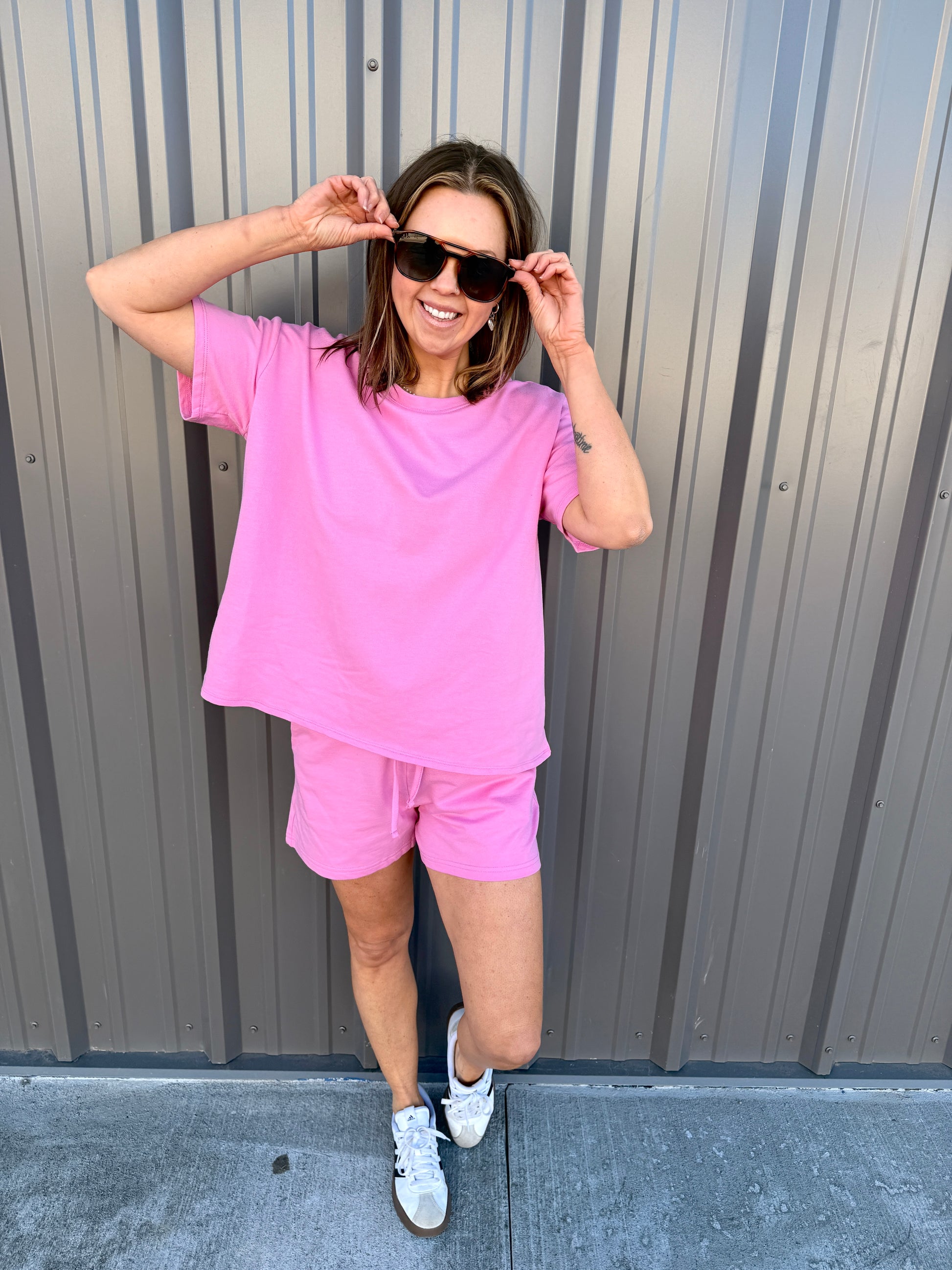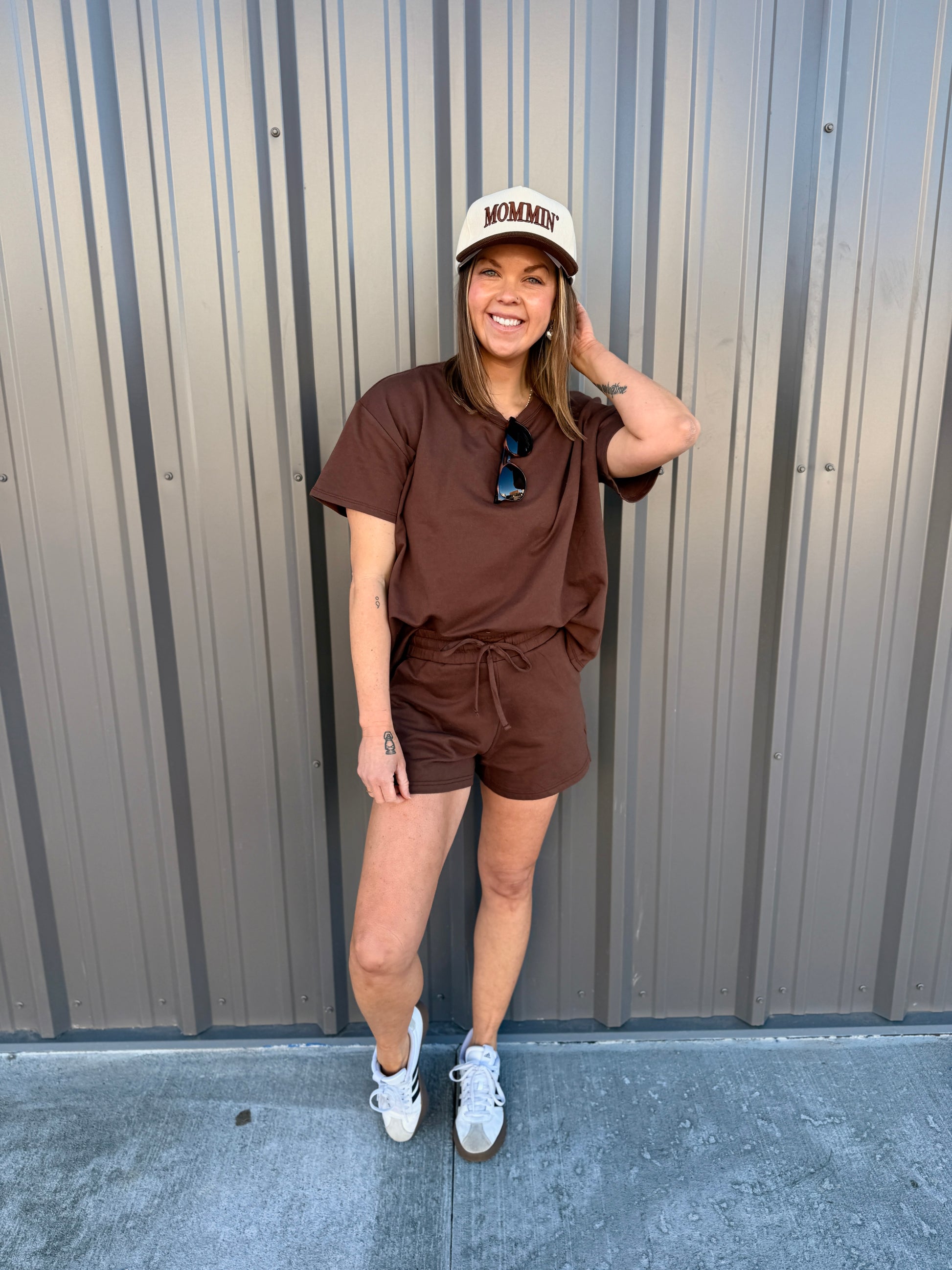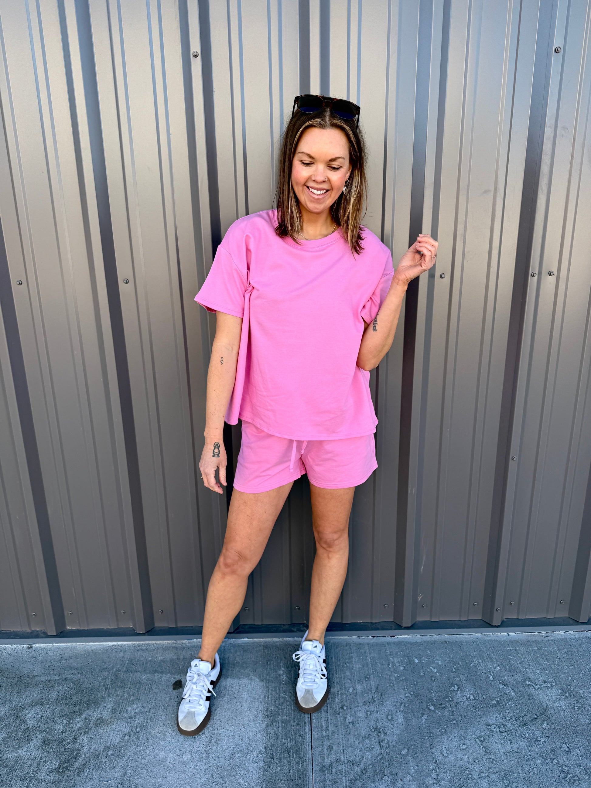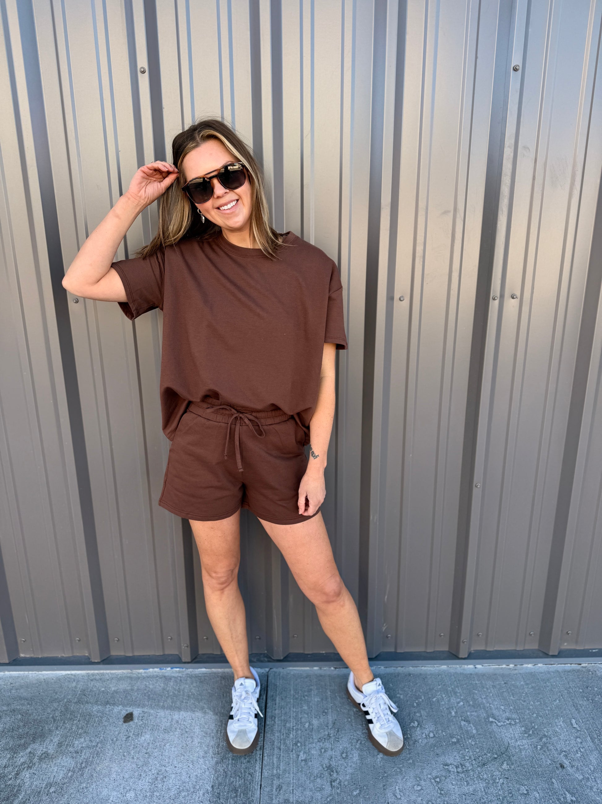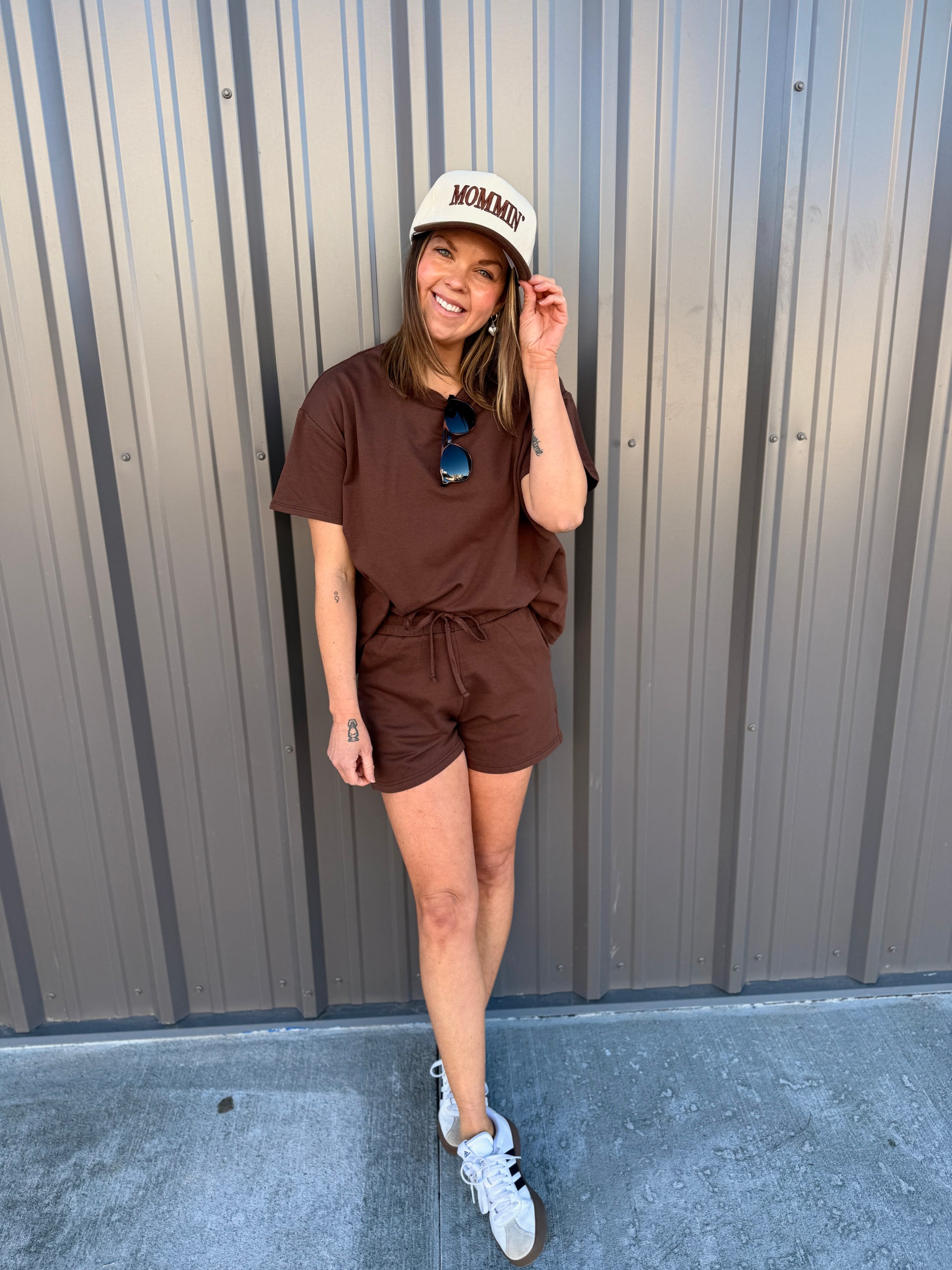 Effortless comfort meets everyday style with this French terry two-piece. The short-sleeve, round-neck top features a relaxed, oversized fit, while the matching shorts include a comfortable elastic waist and functional pockets. Perfect for lounging, errands, or casual days on the go. Wear together for an easy set look or mix and match—each piece is sold separately for versatile styling.