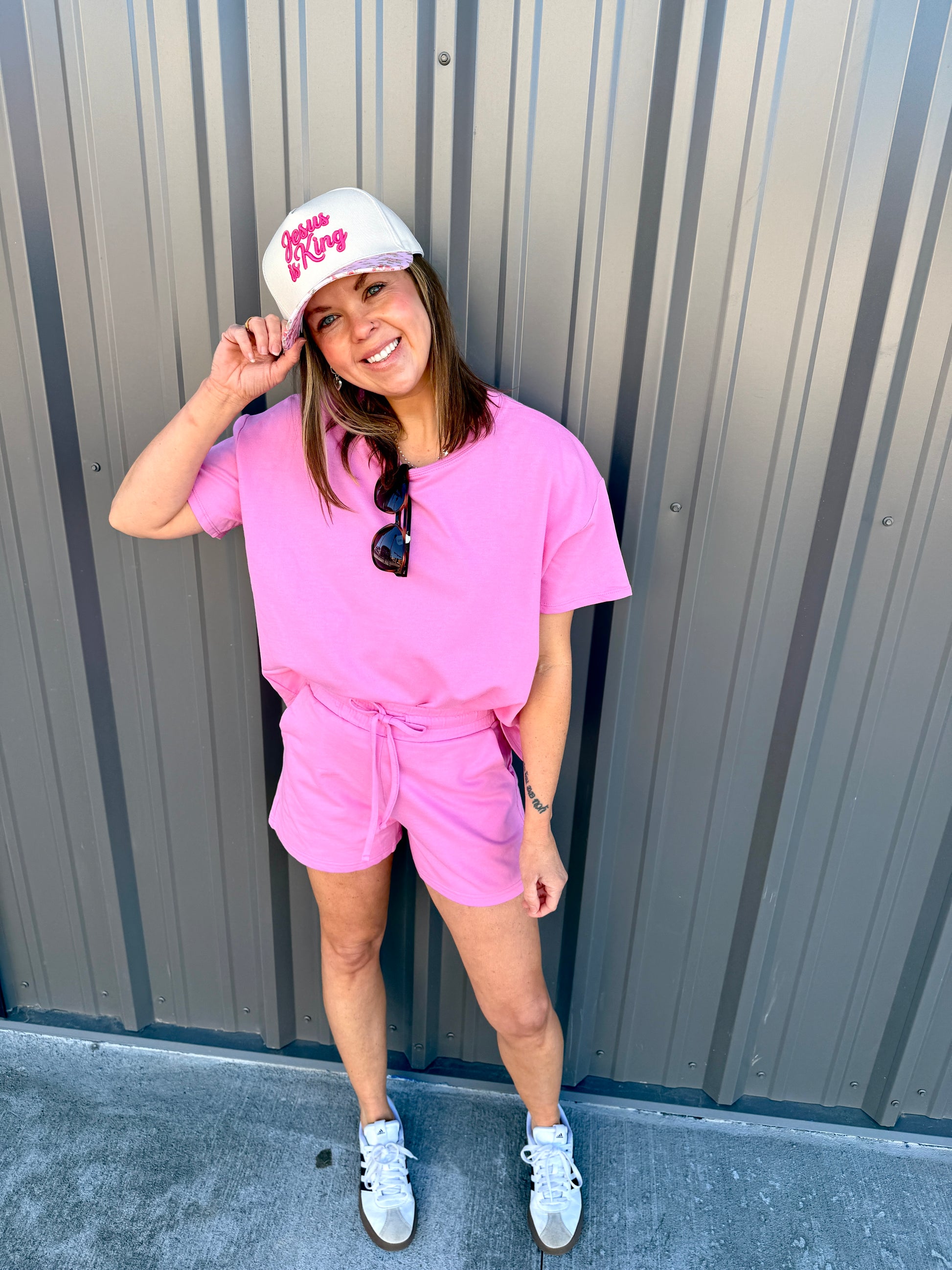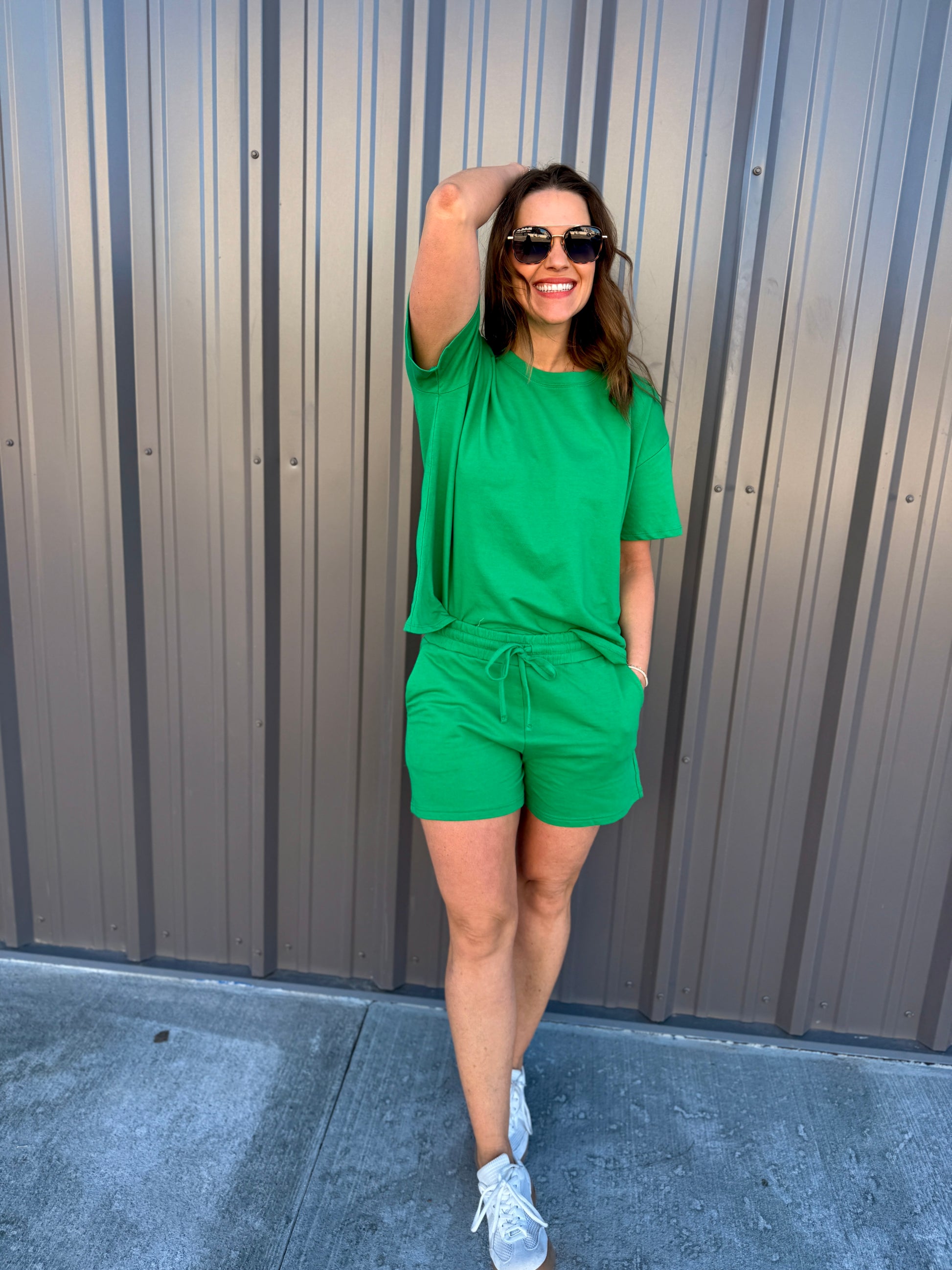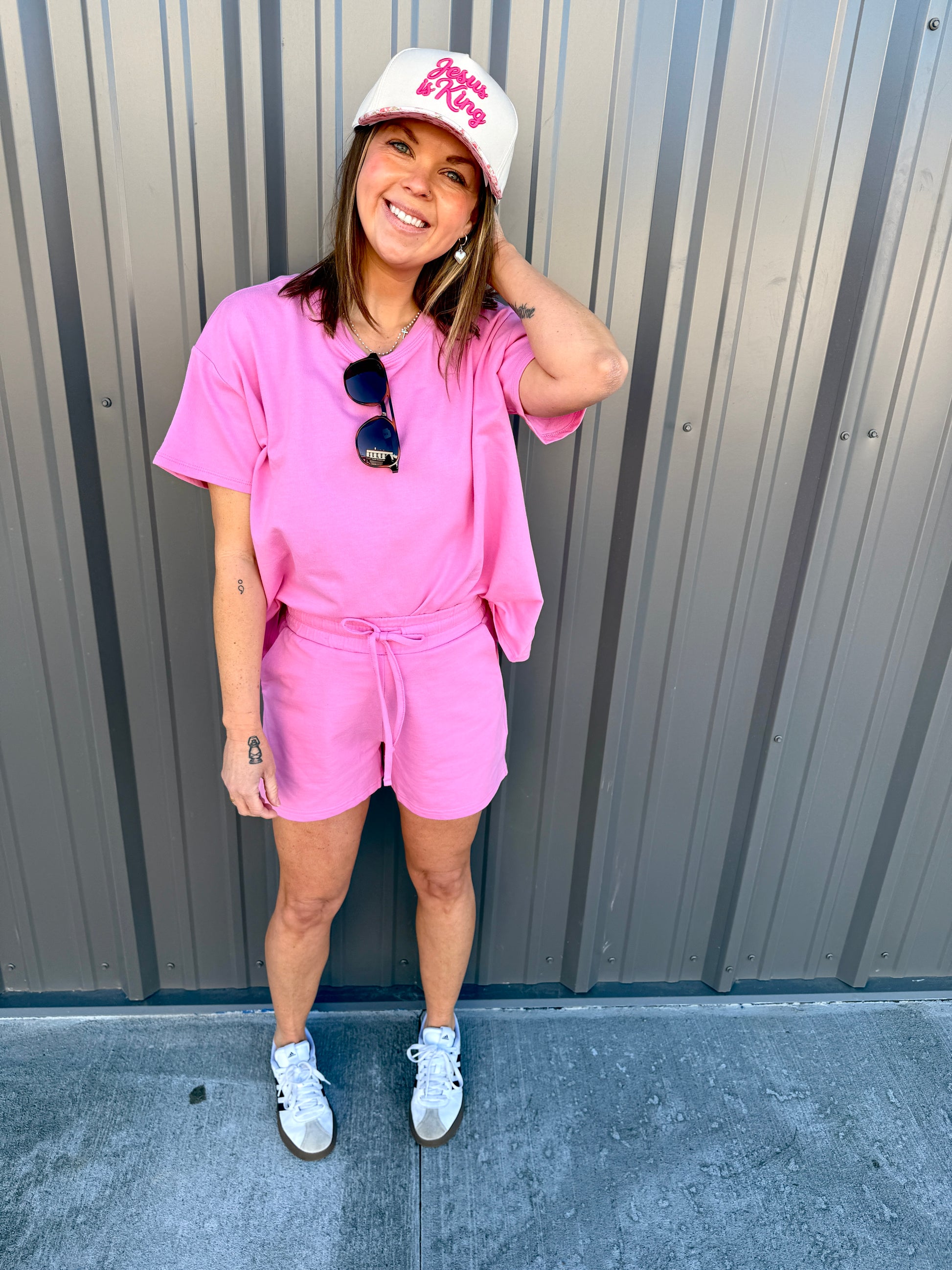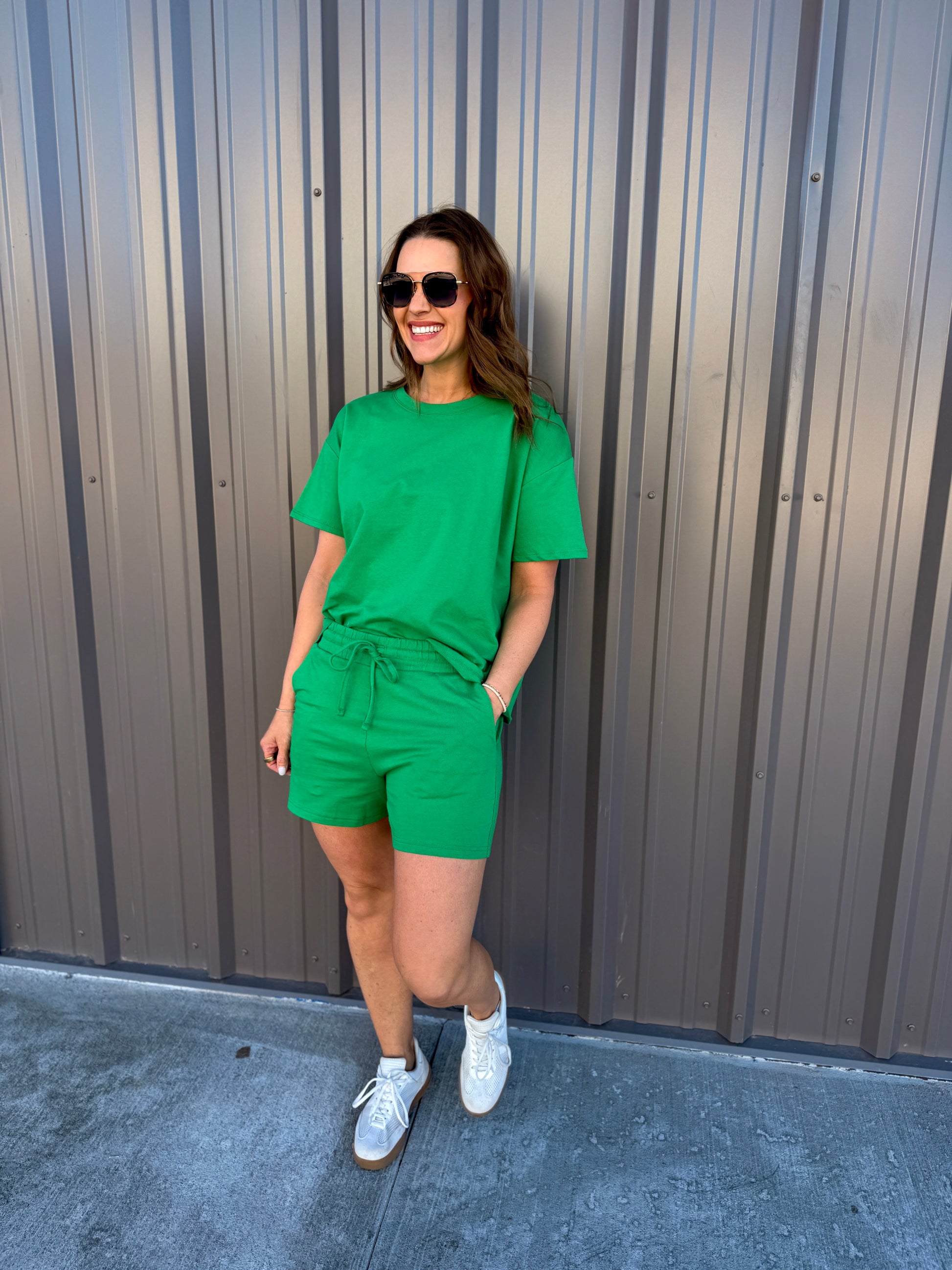 Effortless comfort meets everyday style with this French terry two-piece. The short-sleeve, round-neck top features a relaxed, oversized fit, while the matching shorts include a comfortable elastic waist and functional pockets. Perfect for lounging, errands, or casual days on the go. Wear together for an easy set look or mix and match—each piece is sold separately for versatile styling.