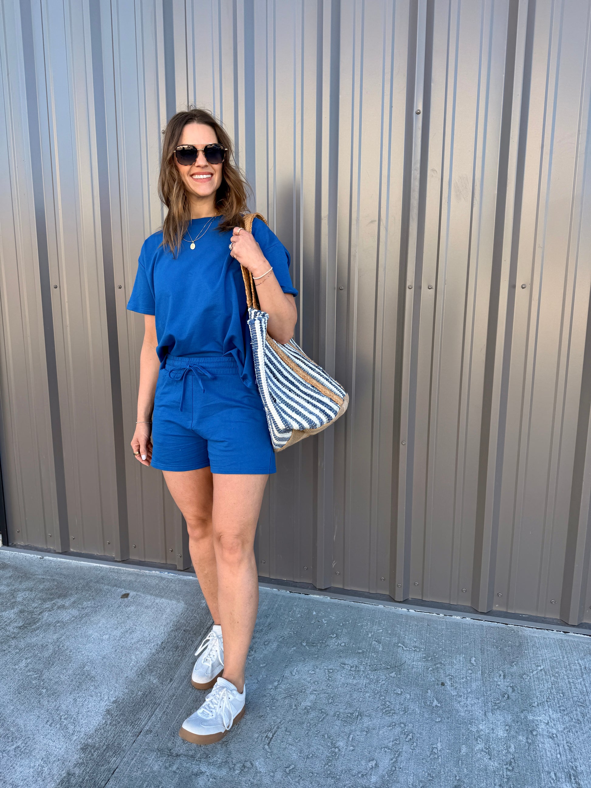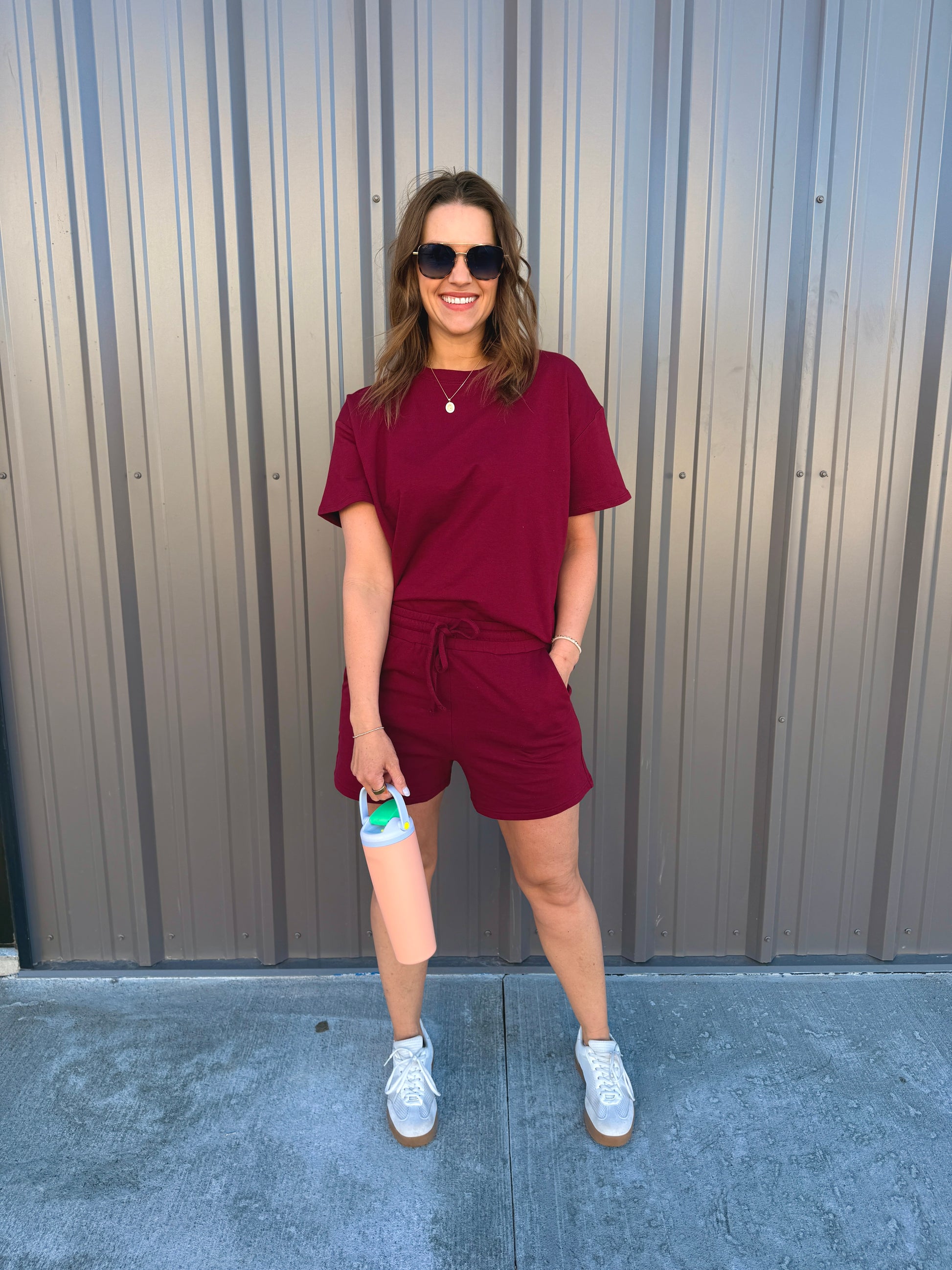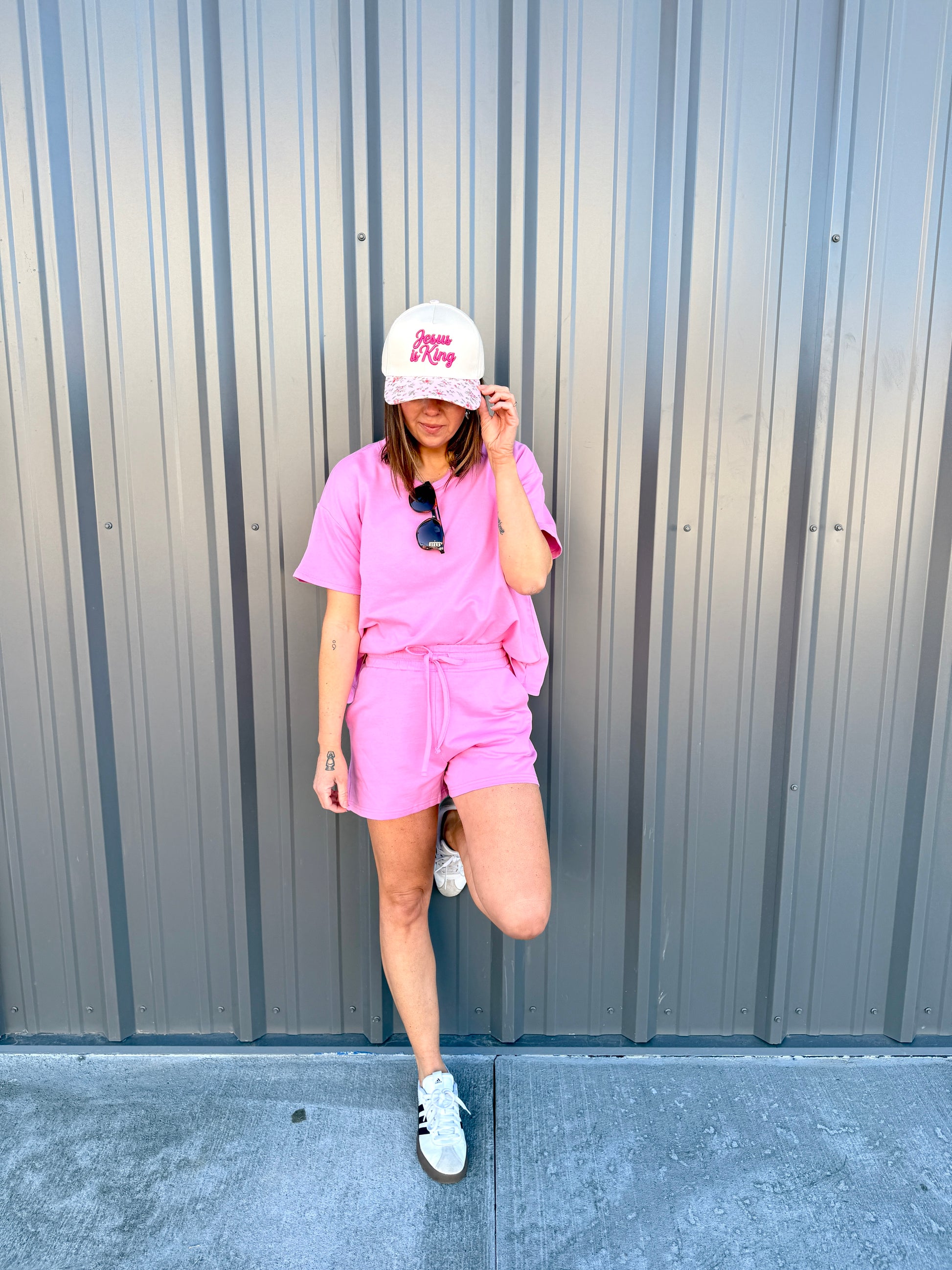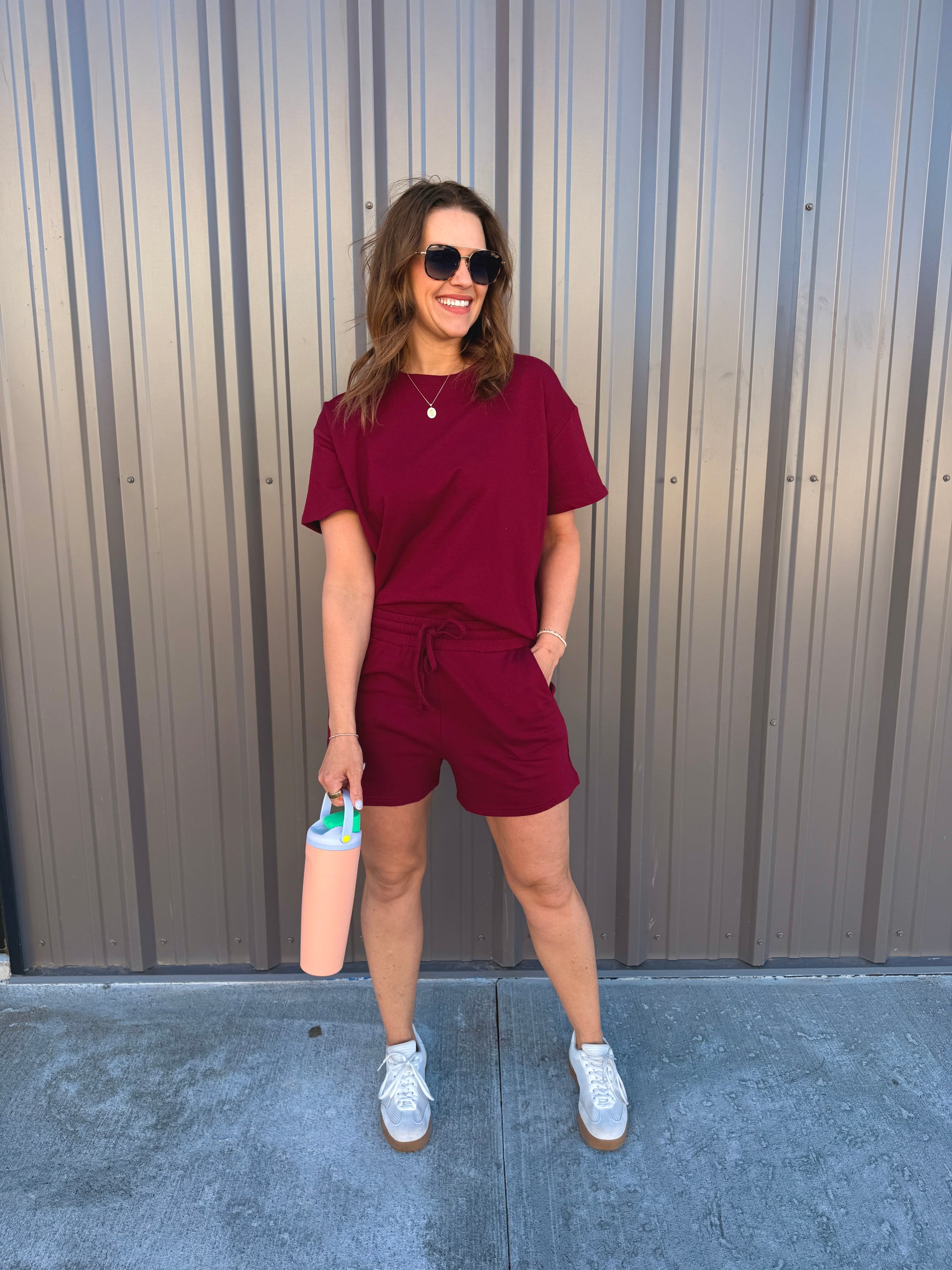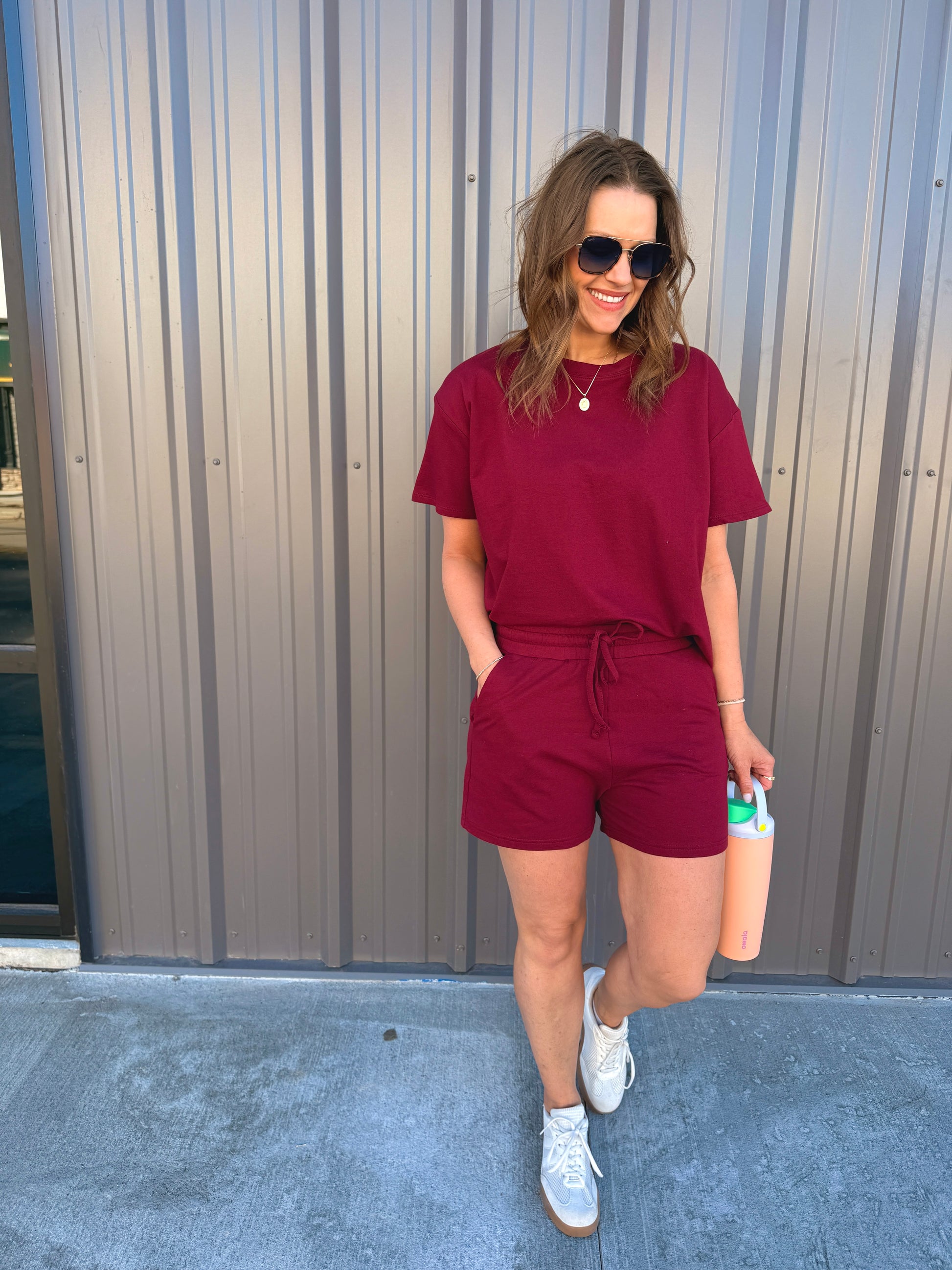 Effortless comfort meets everyday style with this French terry two-piece. The short-sleeve, round-neck top features a relaxed, oversized fit, while the matching shorts include a comfortable elastic waist and functional pockets. Perfect for lounging, errands, or casual days on the go. Wear together for an easy set look or mix and match—each piece is sold separately for versatile styling.