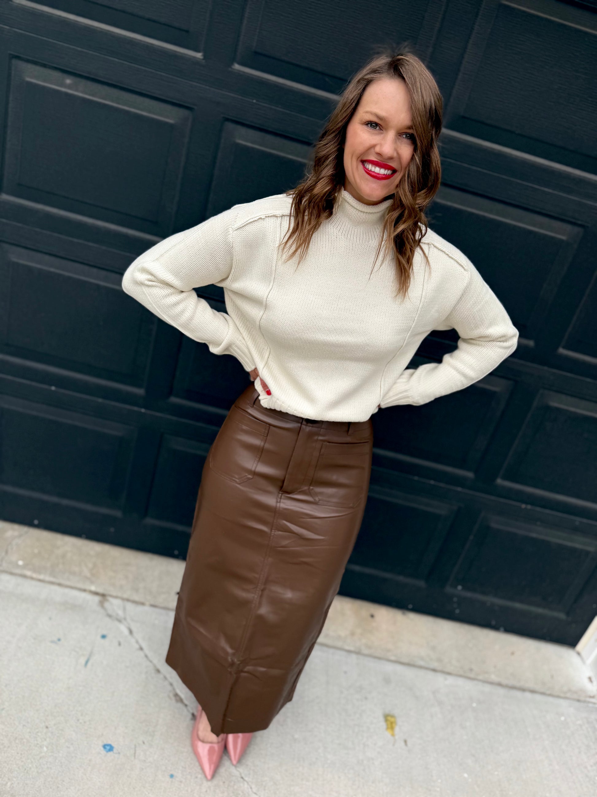 This sweater envelops you in warmth with its high roll neck and relaxed fit, providing a versatile and stylish layering option. Boasting a seam details design, it's perfect for chilly outings or a cozy evening indoors. Pair it with jeans and boots for a casual look, or throw it over a flared skirt for more flair. Its construction promises both comfort and a shot of style.