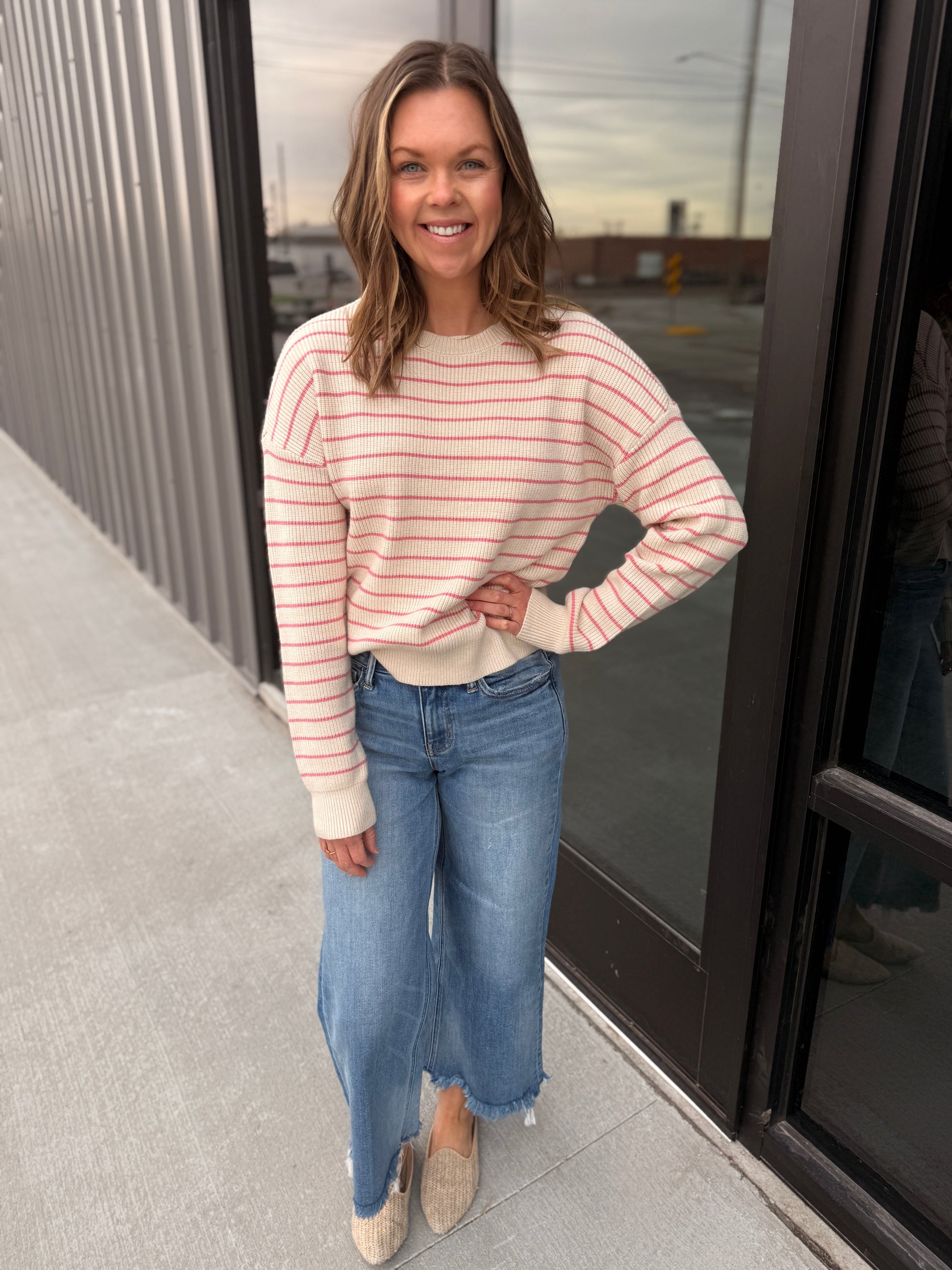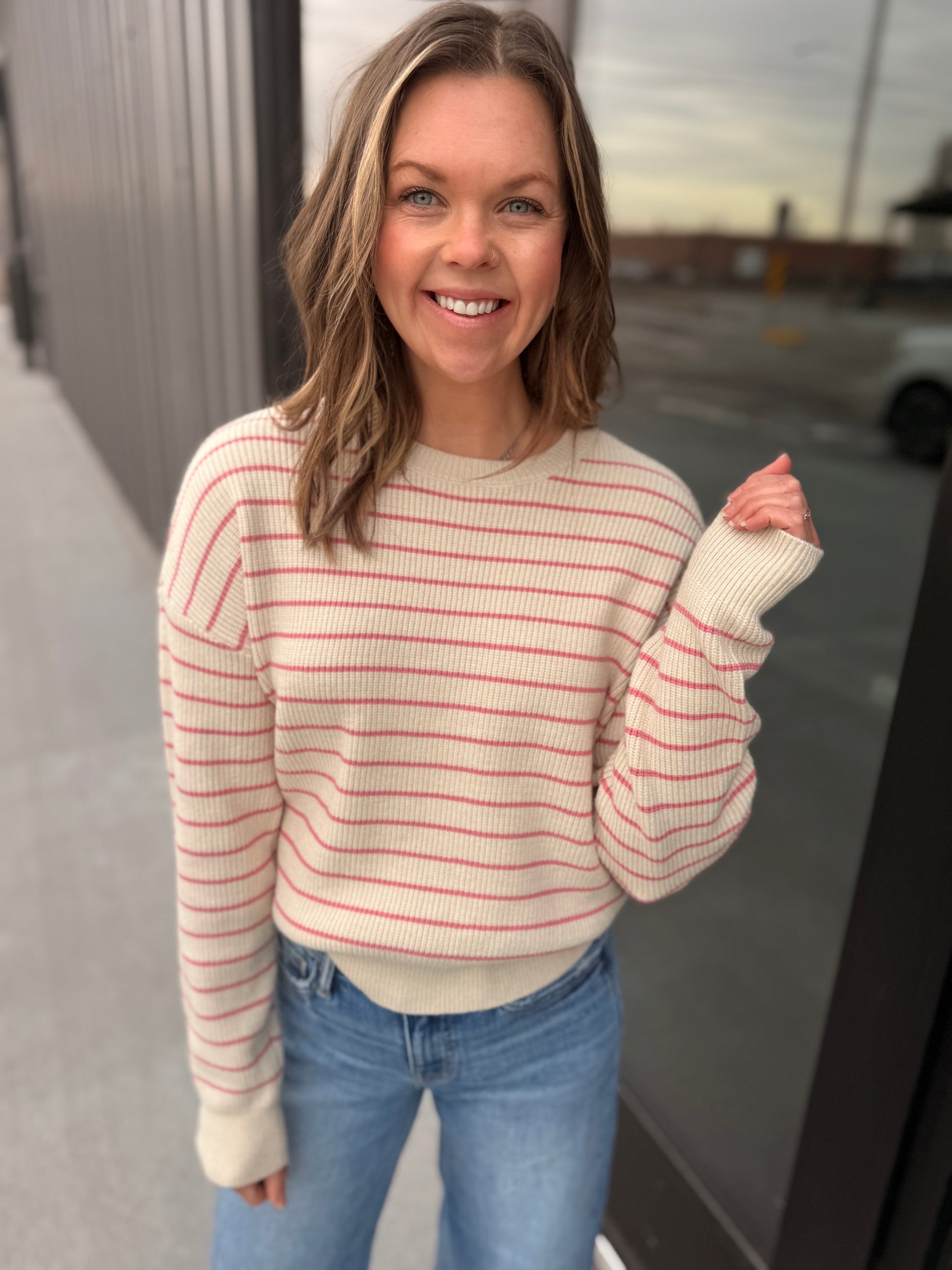 Meet your new effortless everyday knit. The Ely Sweater brings together soft blush stripes on a creamy base for a fresh, feminine look you can style all year long. Designed with a relaxed silhouette and easy drop-shoulder fit, it’s the perfect blend of cozy and chic.