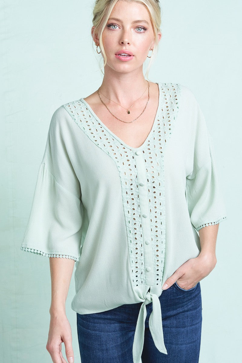 V neckline, Eyelet detail, dropped 3/4-length sleeves and self-tie closure at the front.