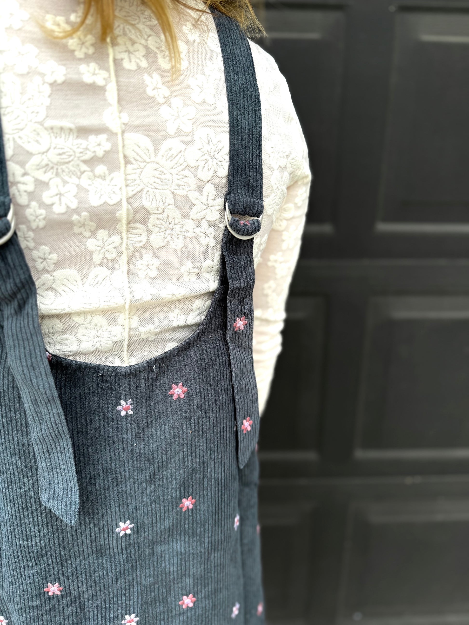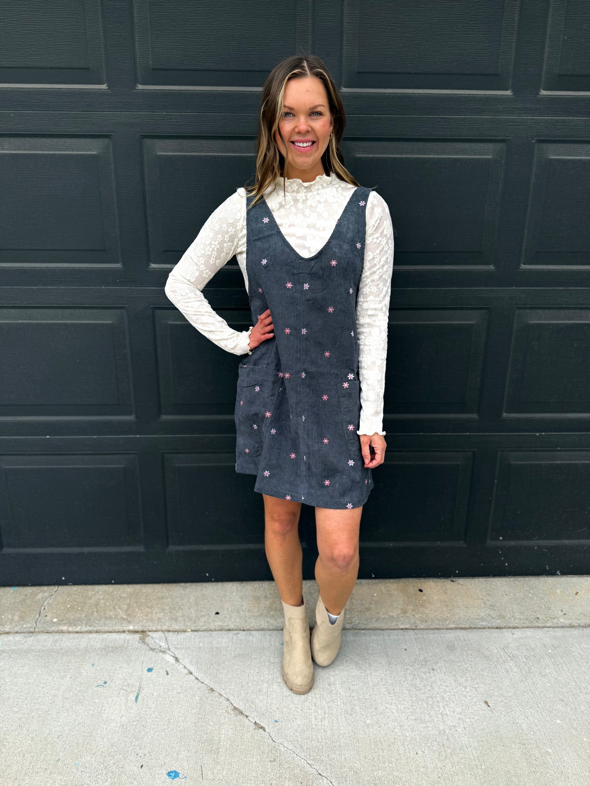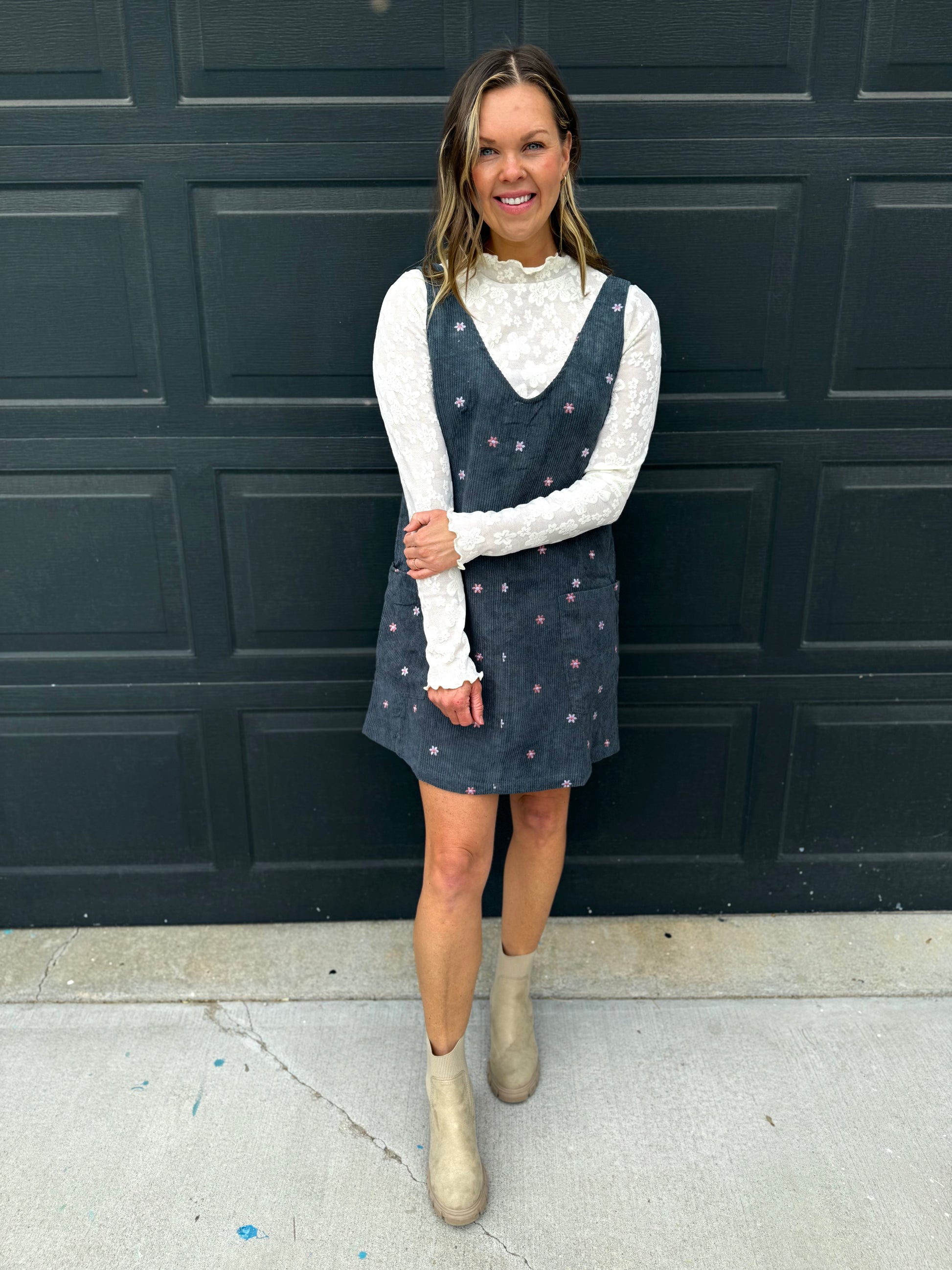 This charming teal overall dress brings vintage vibes with delicate floral embroidery and a flattering V-neckline. Crafted from soft corduroy, it features adjustable straps for a customized fit and practical pockets—because style should be functional too! The modest mini length hits just right, and sizing runs true to size with a relaxed, comfortable fit. Erica's modeling the small, and you can see there's plenty of room to move and groove. Perfect for layering or wearing solo, this dress is your new go-to for effortless charm.