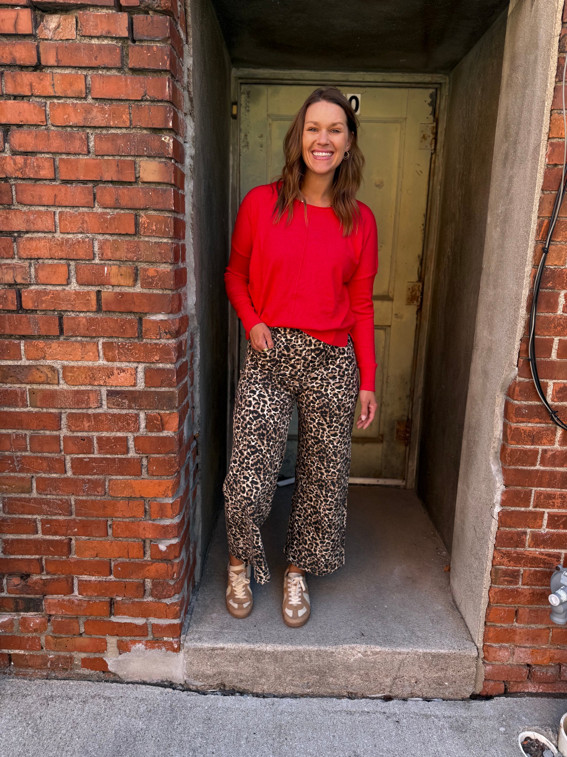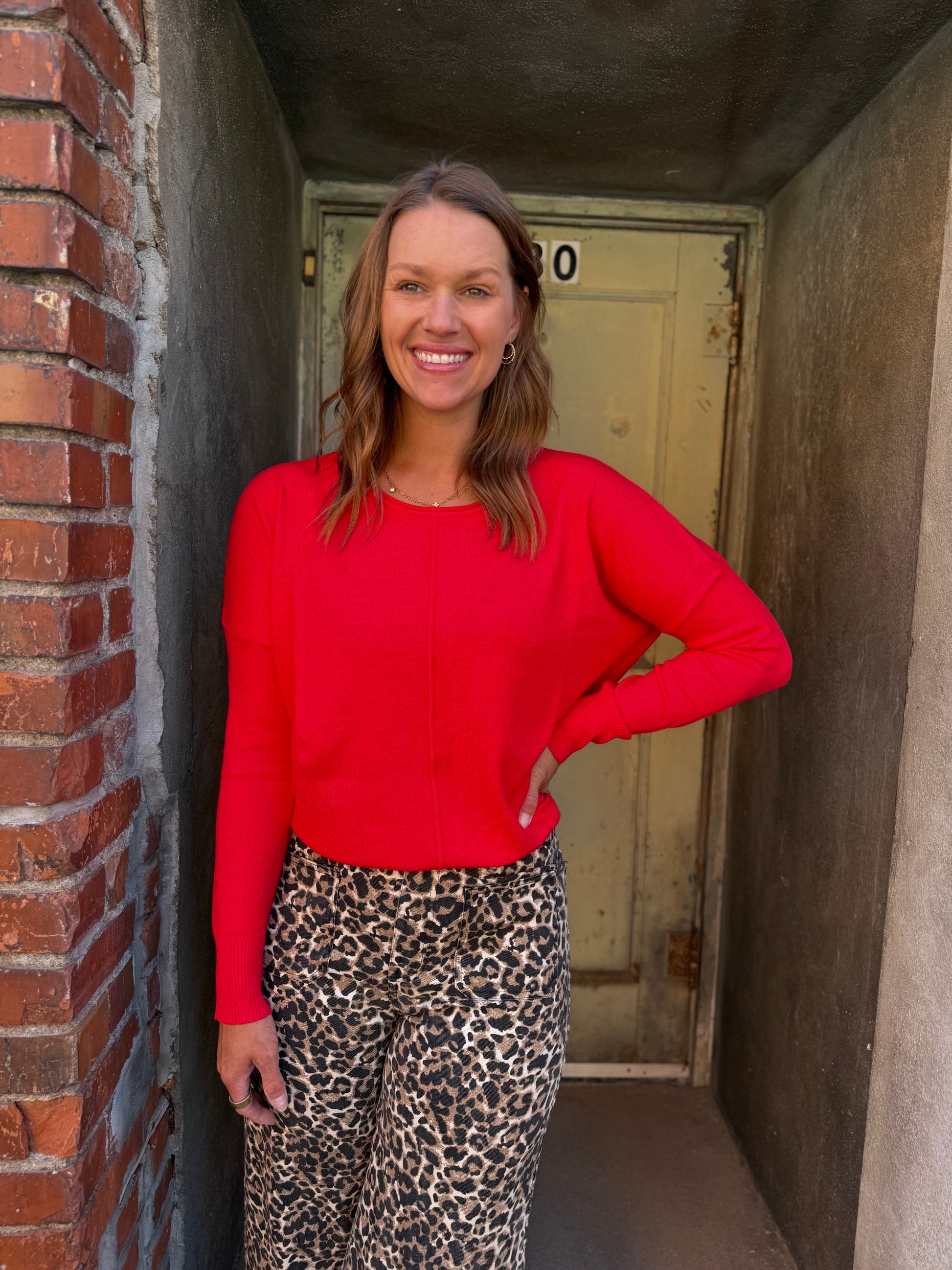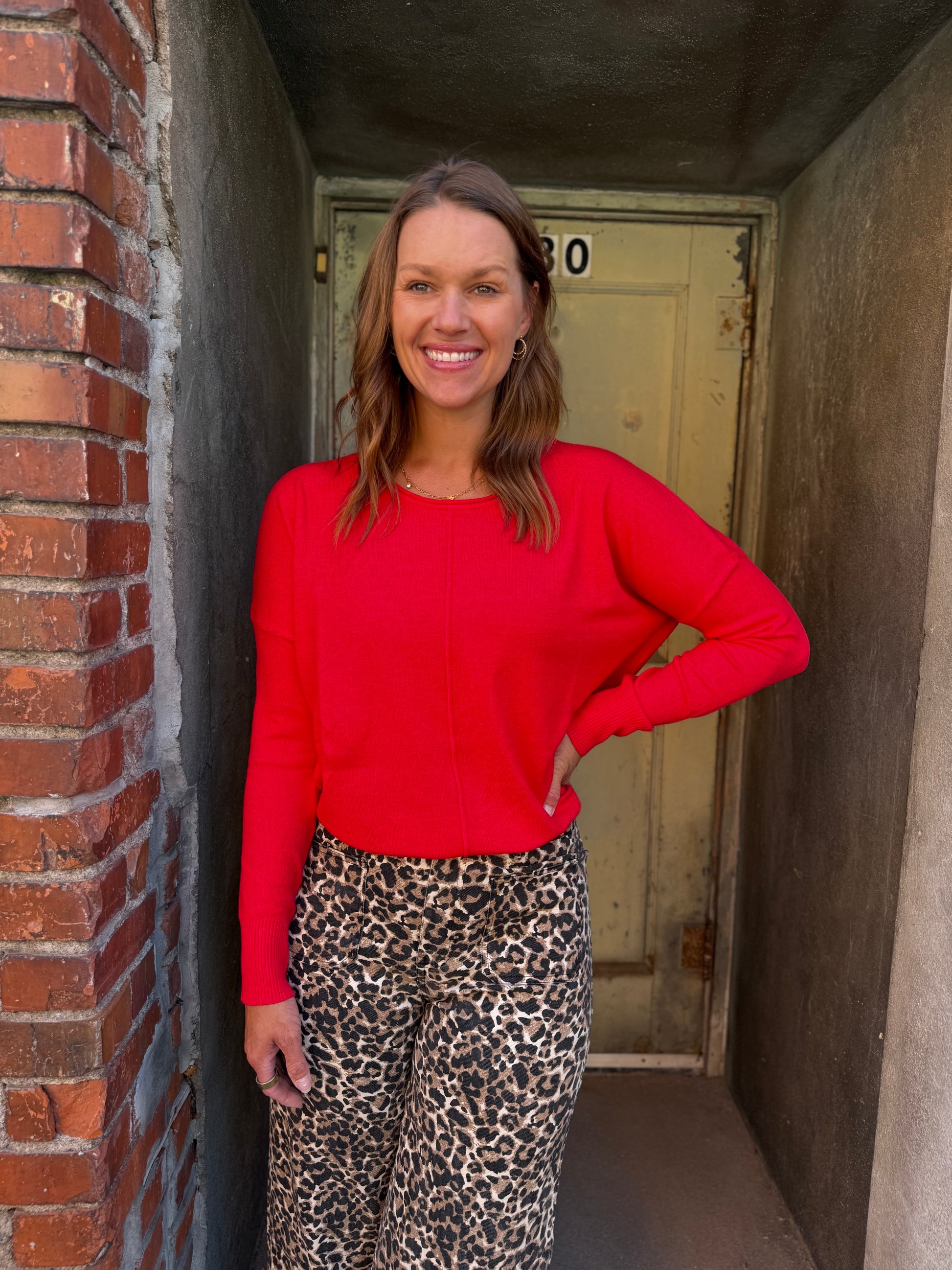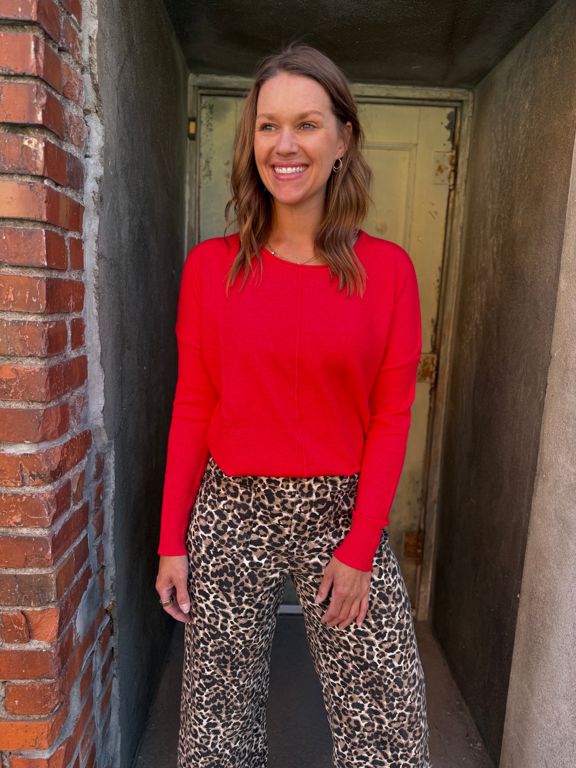 Simple, chic, and endlessly versatile—this round-neck sweater is designed with a subtle front seam detail that adds just the right amount of texture. Crafted from a soft viscose blend, it drapes beautifully with a relaxed fit that pairs effortlessly with denim, skirts, or trousers. The ribbed hem and cuffs give it a clean finish, while the bold hue brings a pop of color to your everyday style.