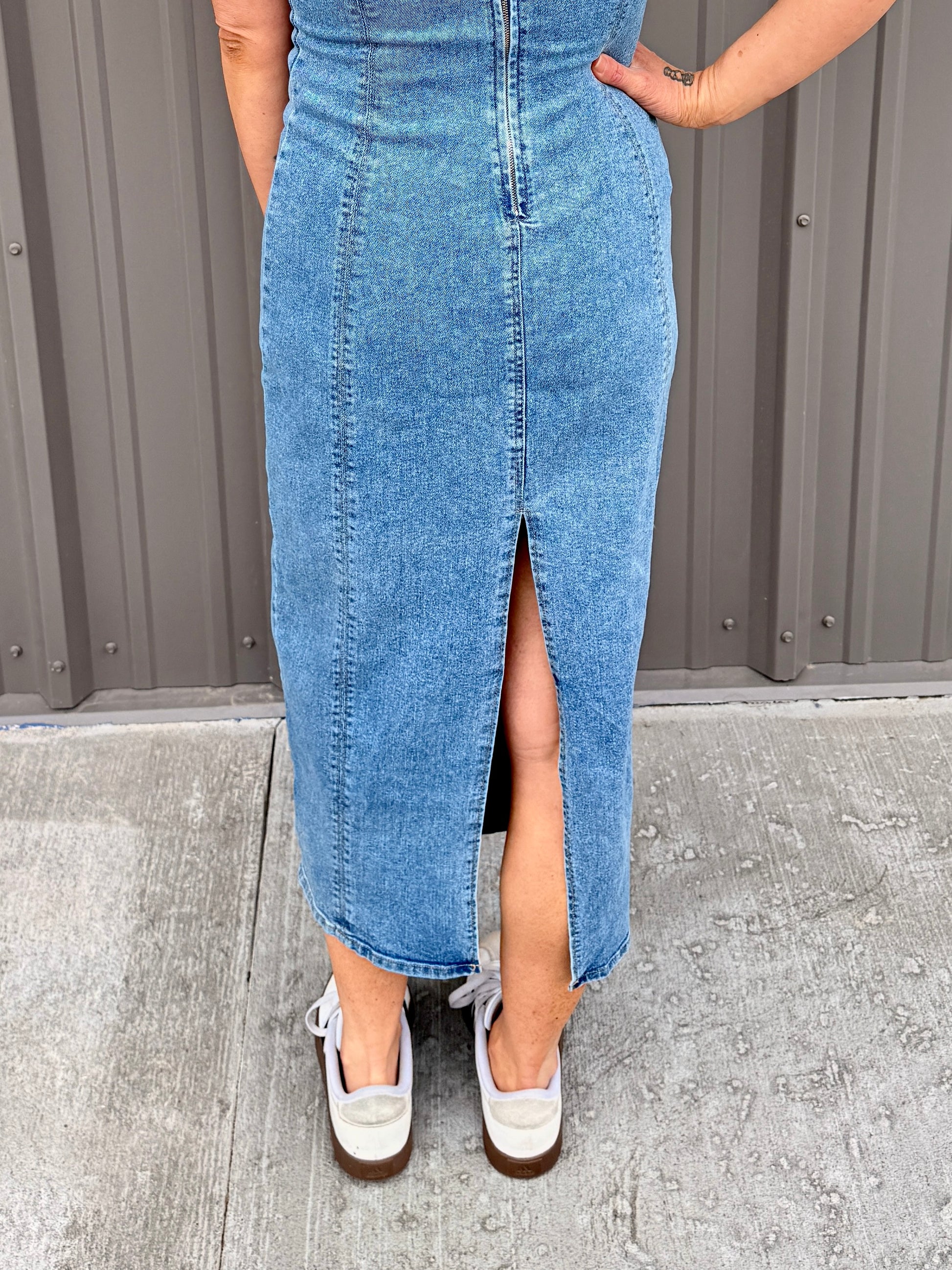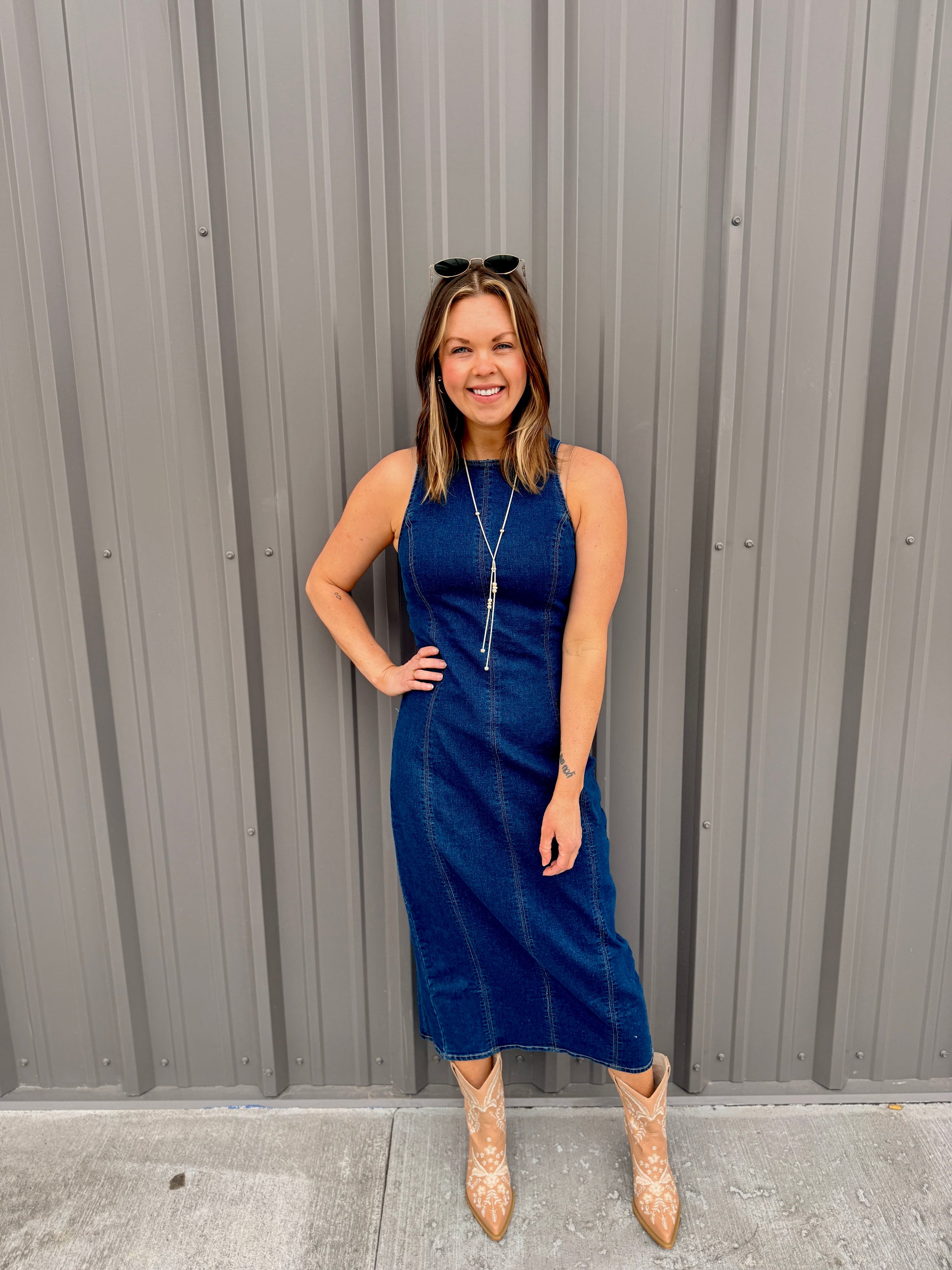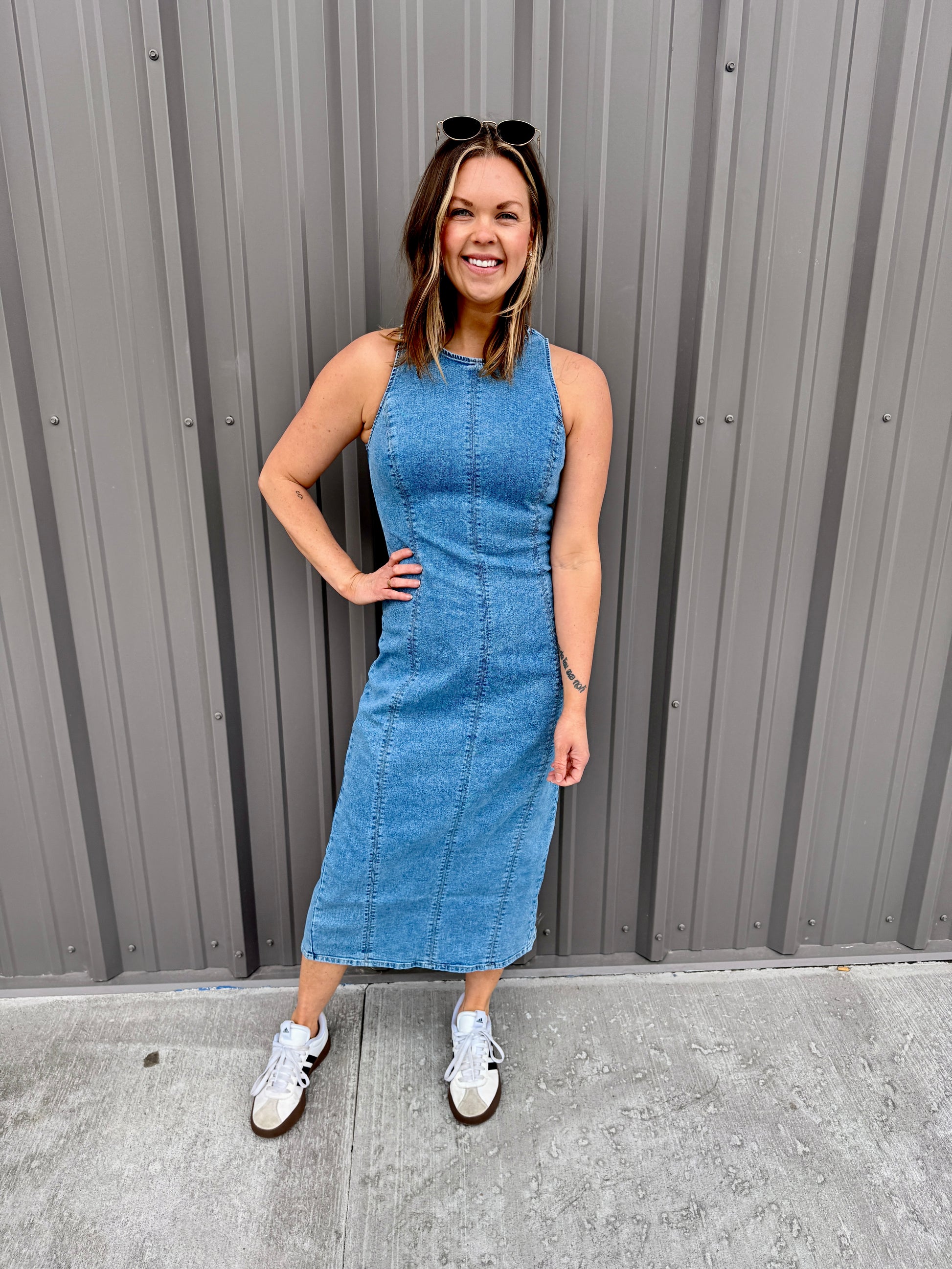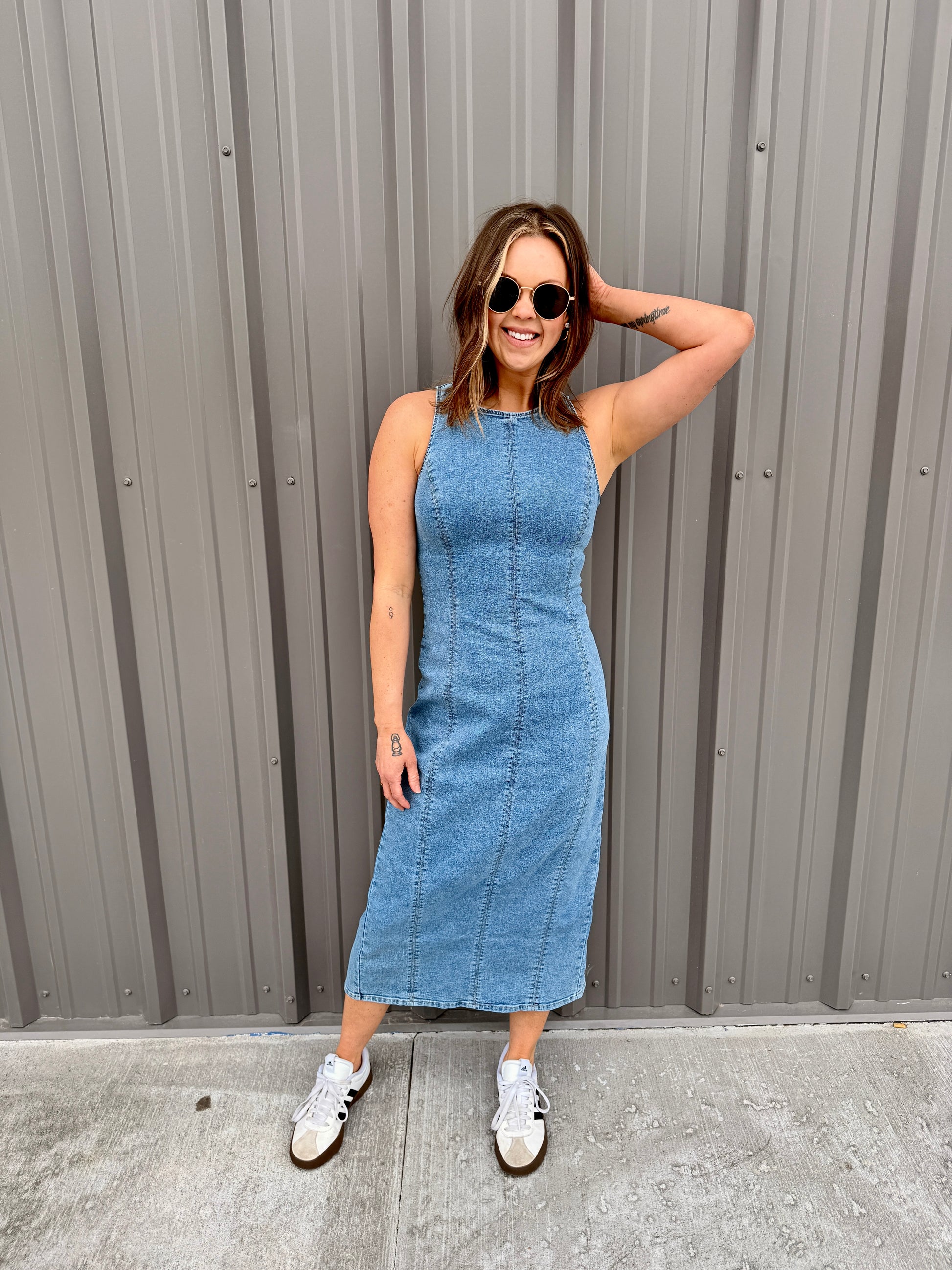 Minimal, modern, and effortlessly cool — the Harper Midi Denim Dress is your go-to for understated style. Designed with a classic crew neckline and a sleeveless cut, this straight silhouette creates a clean, elongated shape that flatters with ease. The enzyme wash gives the denim a soft, lived-in feel while enhancing its natural texture for that perfectly worn look.
