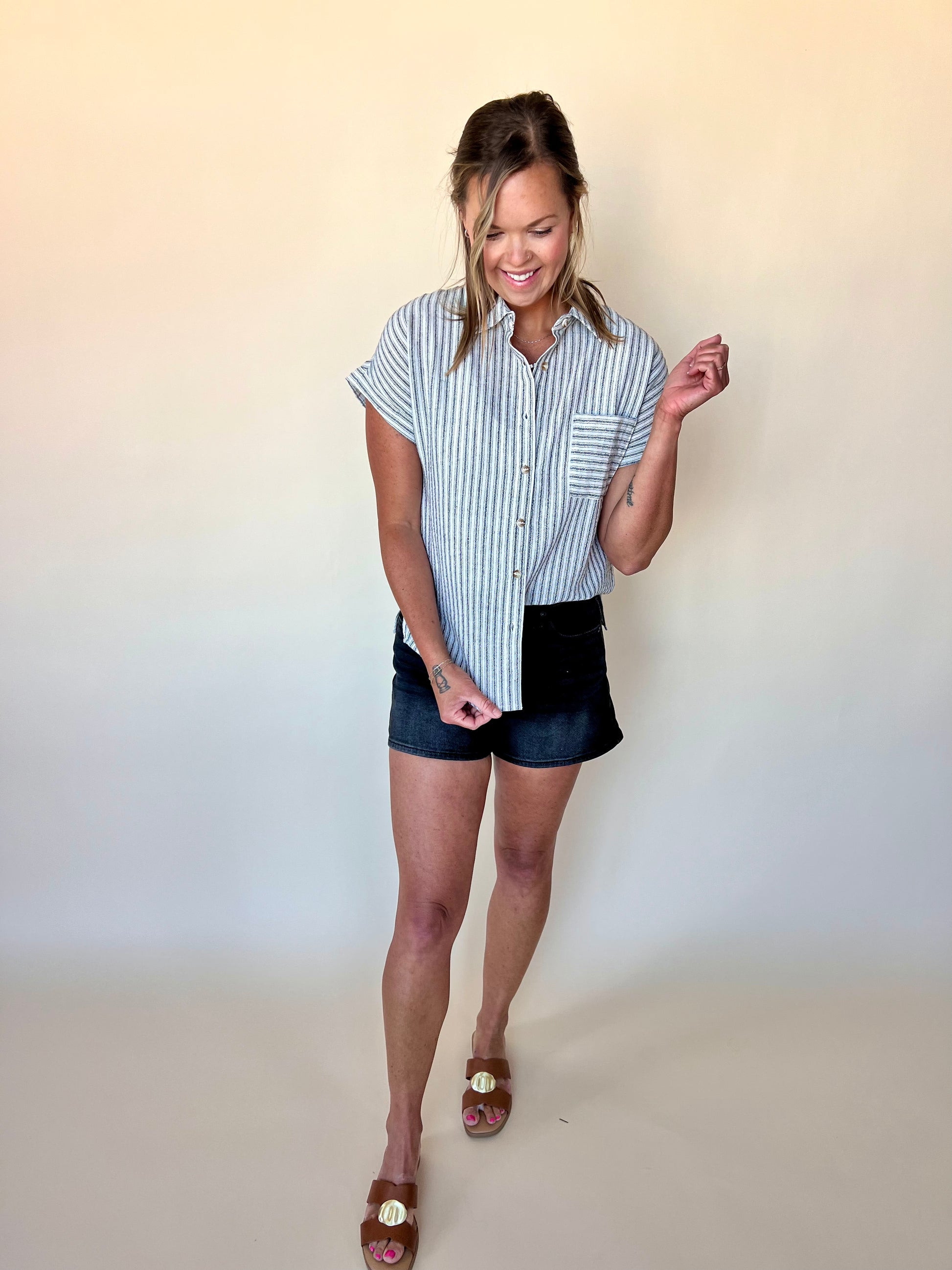 Elevate your casual wardrobe with the Lynny Linen Top. Crafted from a breathable linen blend, this woven shirt features a classic collared design and a button-up front for a timeless look. The striped pattern adds a touch of nautical/summer charm, while the roll-up sleeve detail offers a relaxed, laid-back vibe. With a functional pocket and short sleeves, this versatile top is perfect for warmer days, whether you're lounging or out for a stroll. The Lynny Linen Top combines effortless style and comfort, making it a must-have for any wardrobe.