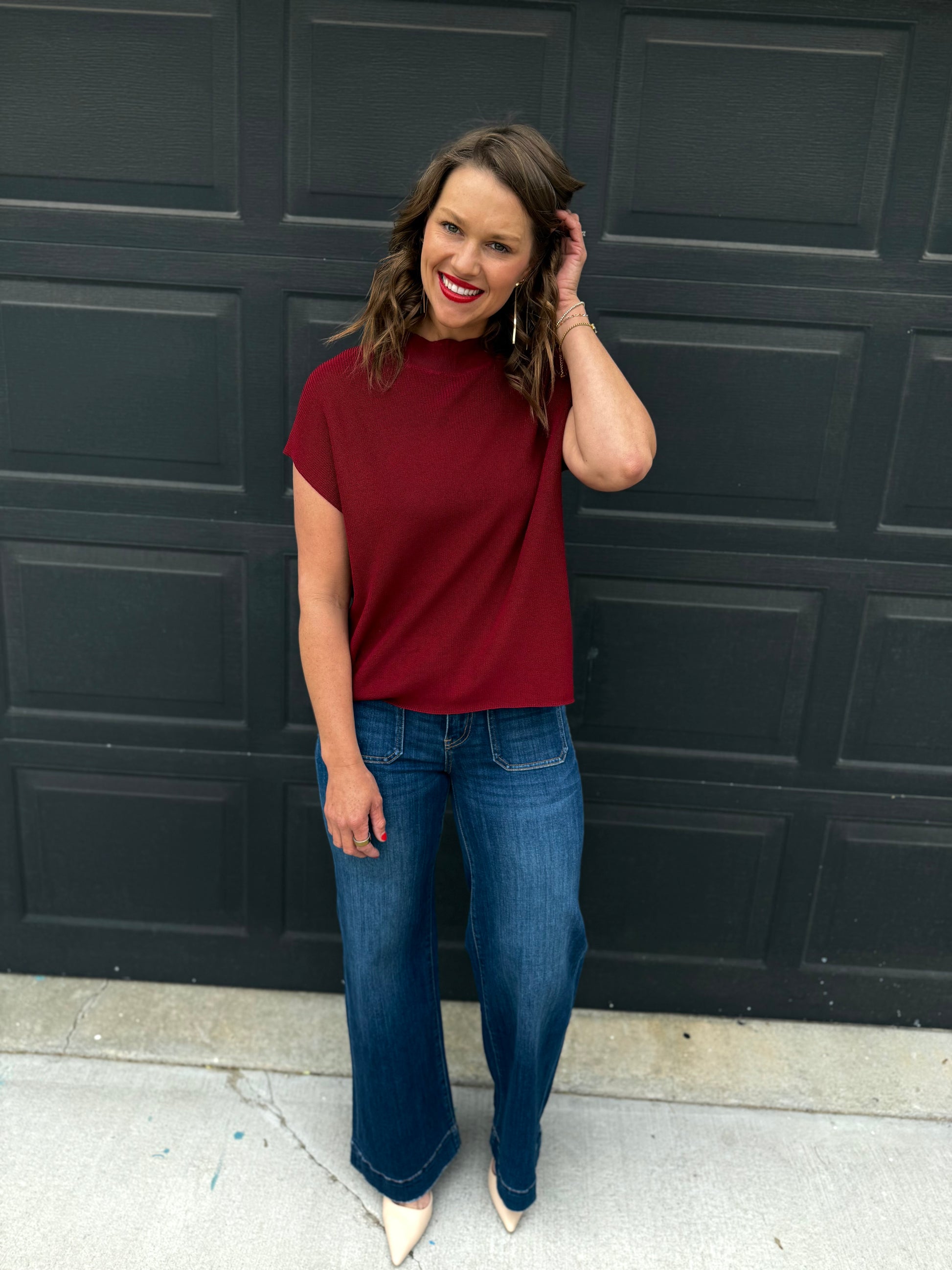 Solid lightweight sweater top featuring cap sleeves, a high round neckline and a relaxed body. Pair with any bottoms and style with a front tuck!