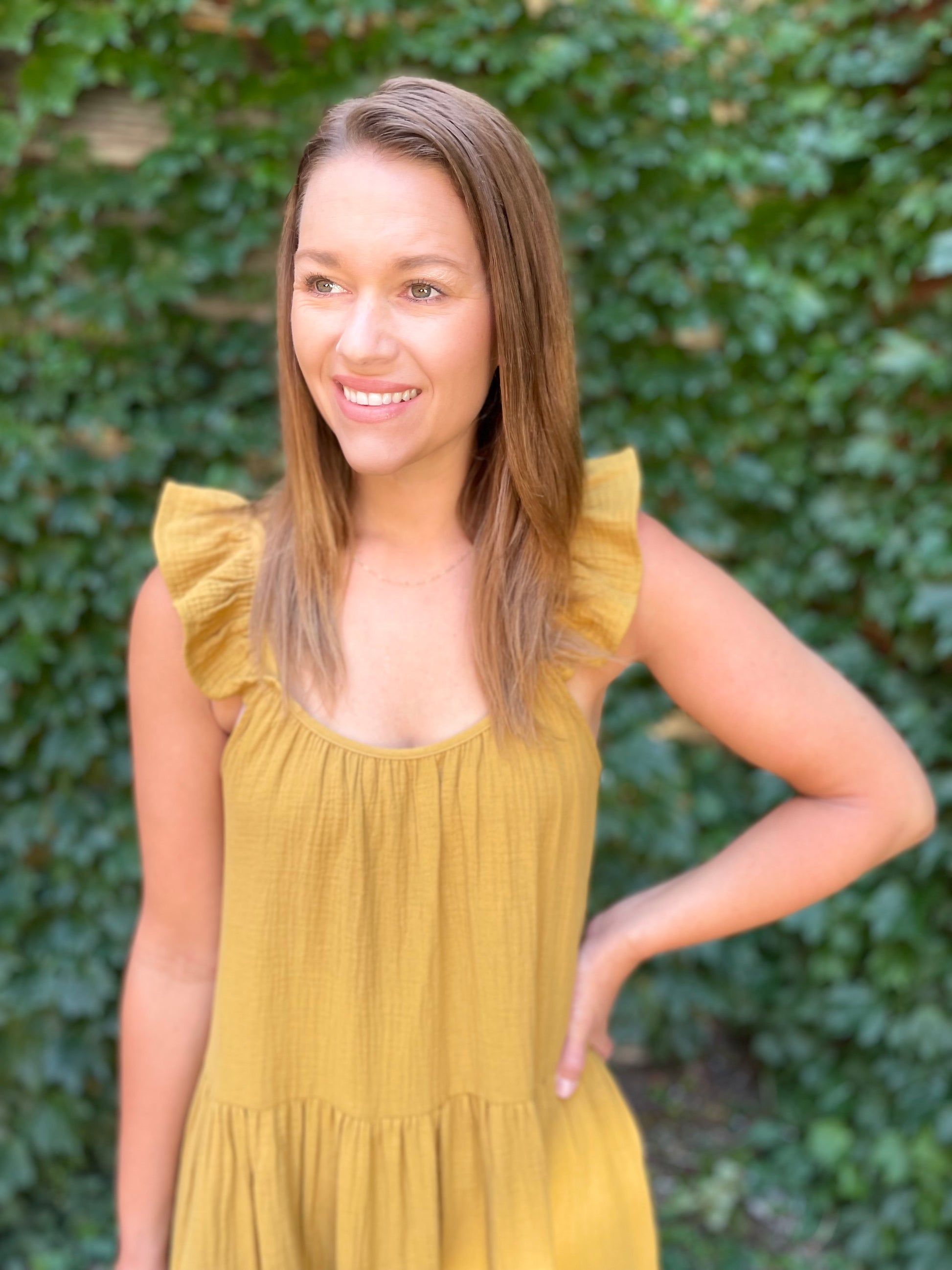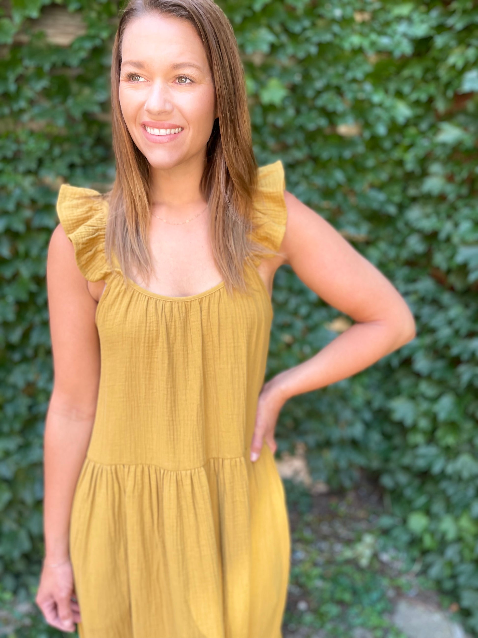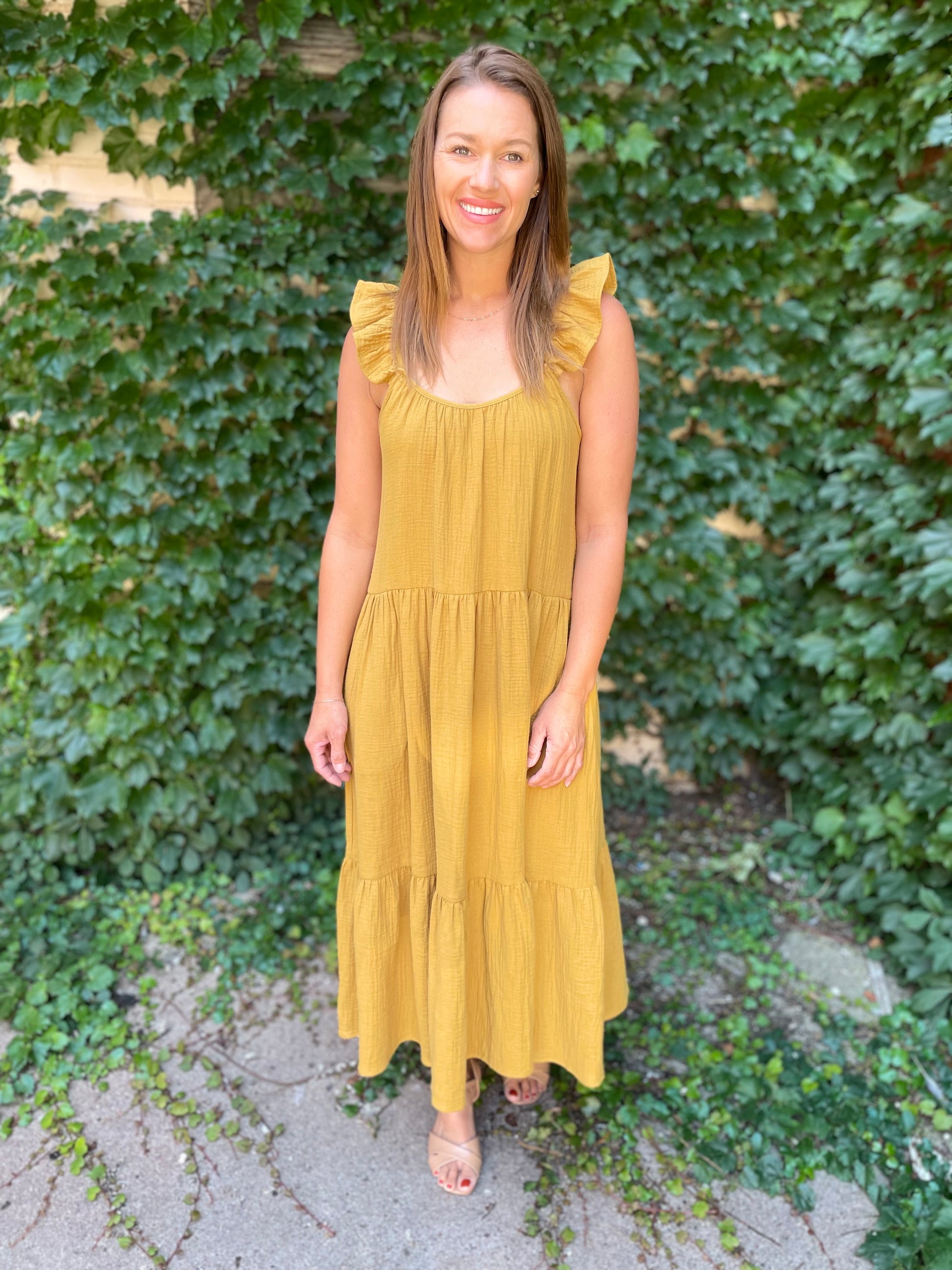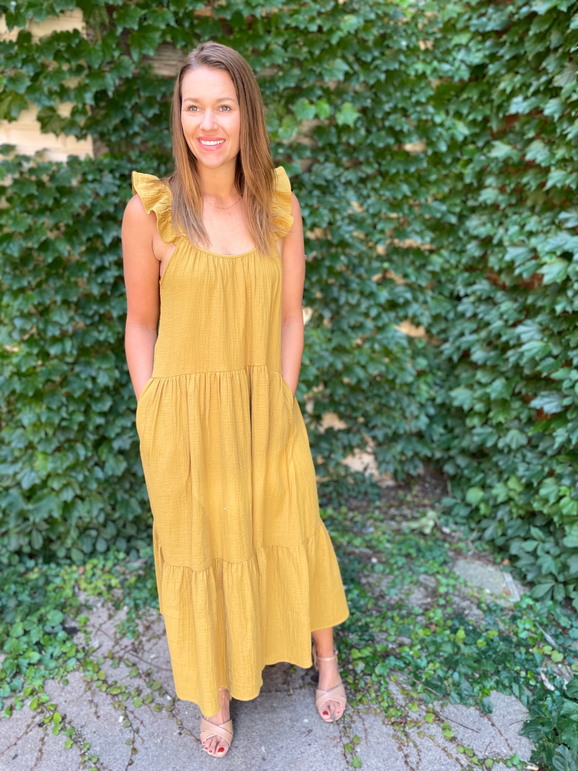 This mustard long dress features ruffled sleeve detail and a tiered design for a flattering and stylish look. Perfect for any occasion, this dress adds a touch of elegance to your wardrobe. Expertly crafted, it offers a comfortable and chic fit.