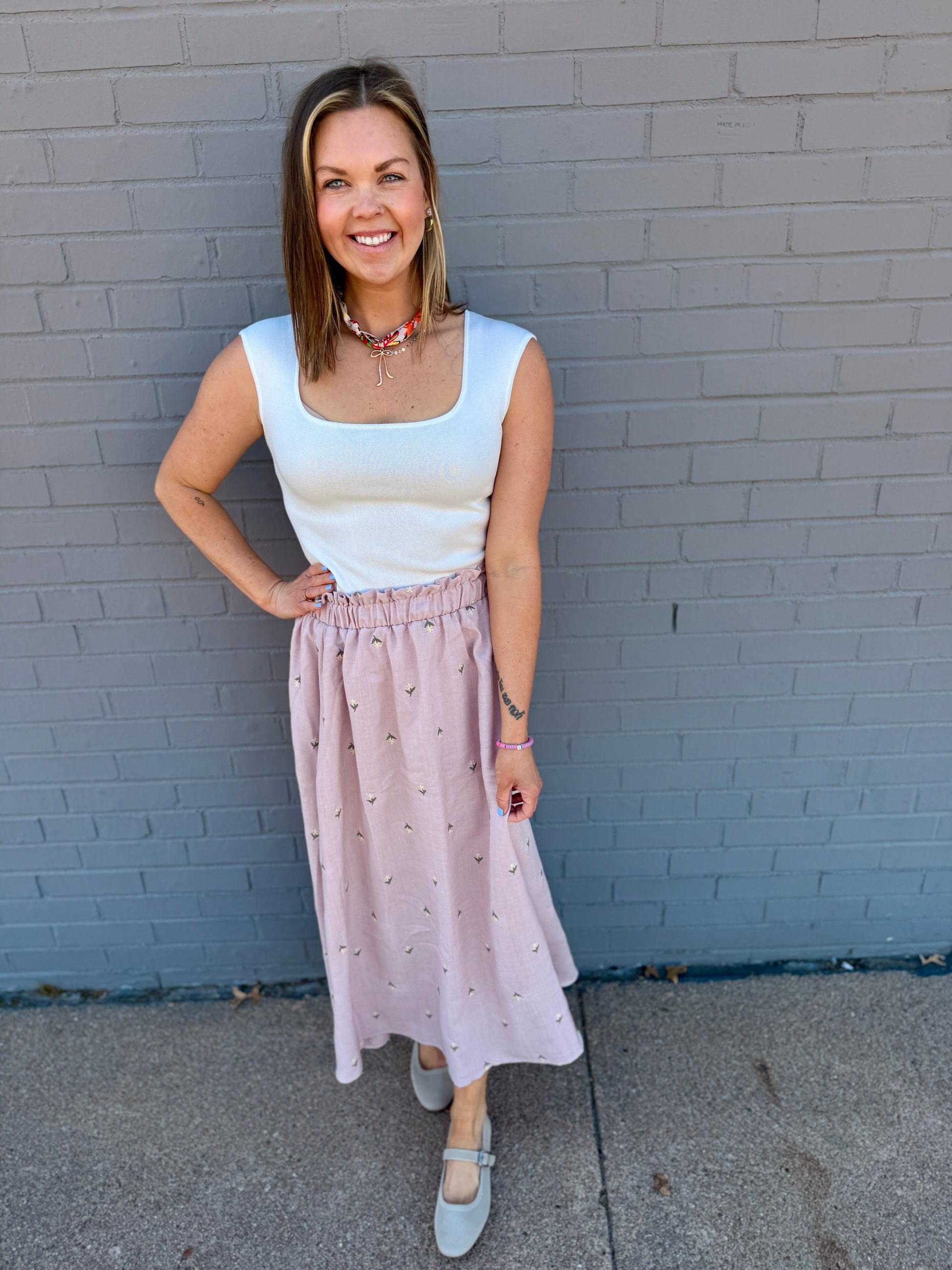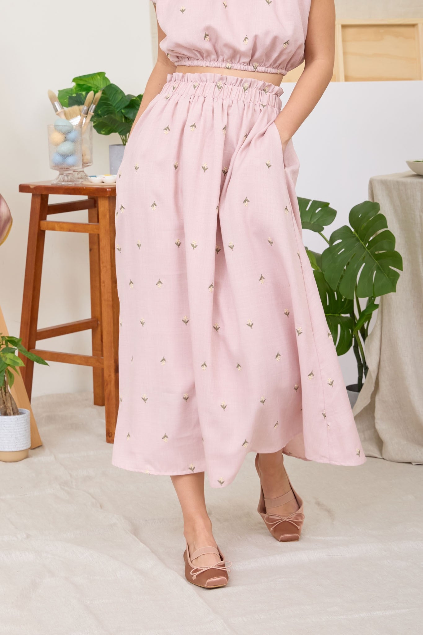The comfortable high-waist design features a flexible elastic waistband finished with a charming ruffled edge, creating a flattering silhouette that cinches perfectly. Available in two soft, versatile shades—ivory and pink—this lined midi skirt offers a whimsical aesthetic that feels both modern and timeless.