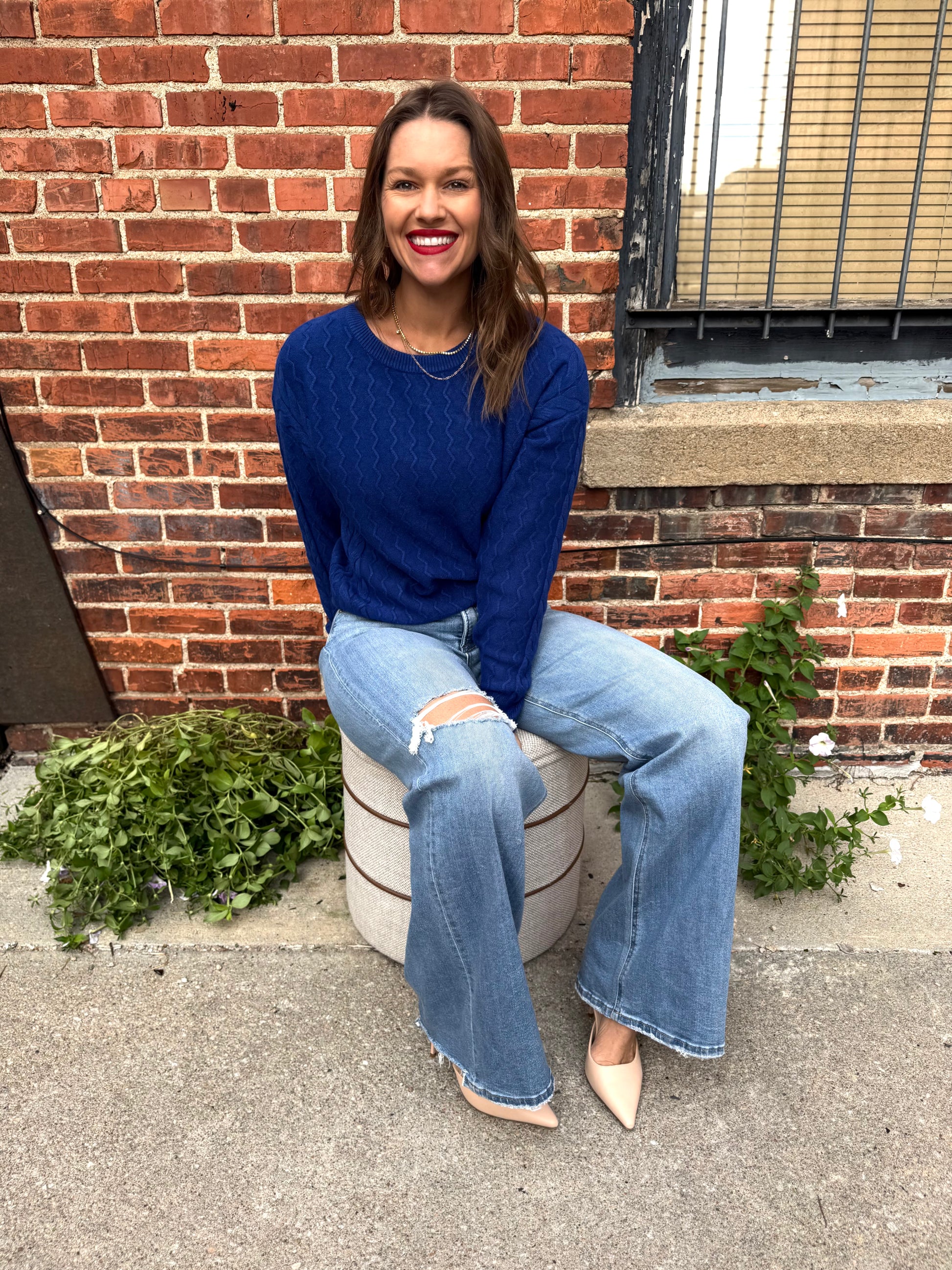 This long-sleeve round neck sweater features a unique textured zig-zag pattern on the front, adding a stylish twist to a classic design. The soft, cozy fabric ensures warmth and comfort, making it ideal for cooler weather. The round neckline provides a timeless look, while the textured detailing on the front elevates the sweater's overall style. With its relaxed fit and chic design, this sweater pairs effortlessly with jeans, skirts, or trousers for a versatile and polished outfit. Perfect for casual outings or dressing up for a more refined look, it's a must-have piece for any wardrobe.