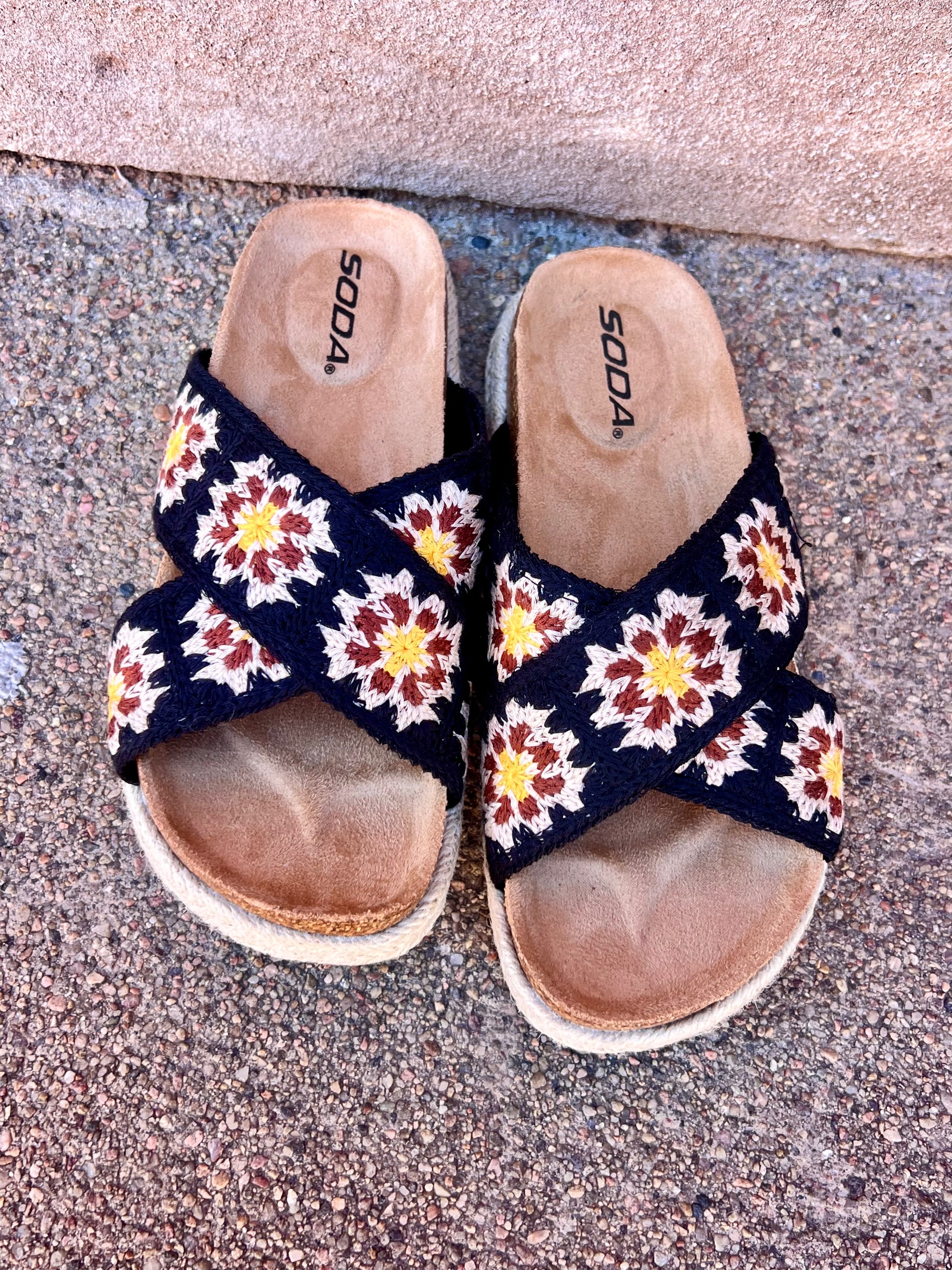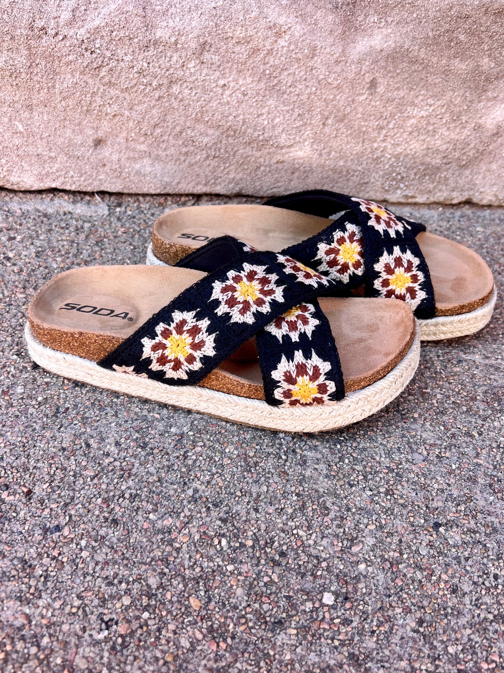 Introducing the Salina Sandal, perfect for any occasion! Its open toe design and comfy sole will keep your feet feeling refreshed all day. The two black straps feature delicate crochet flowers, adding a touch of elegance to this trendy sandal. Step into style and comfort with Salina!