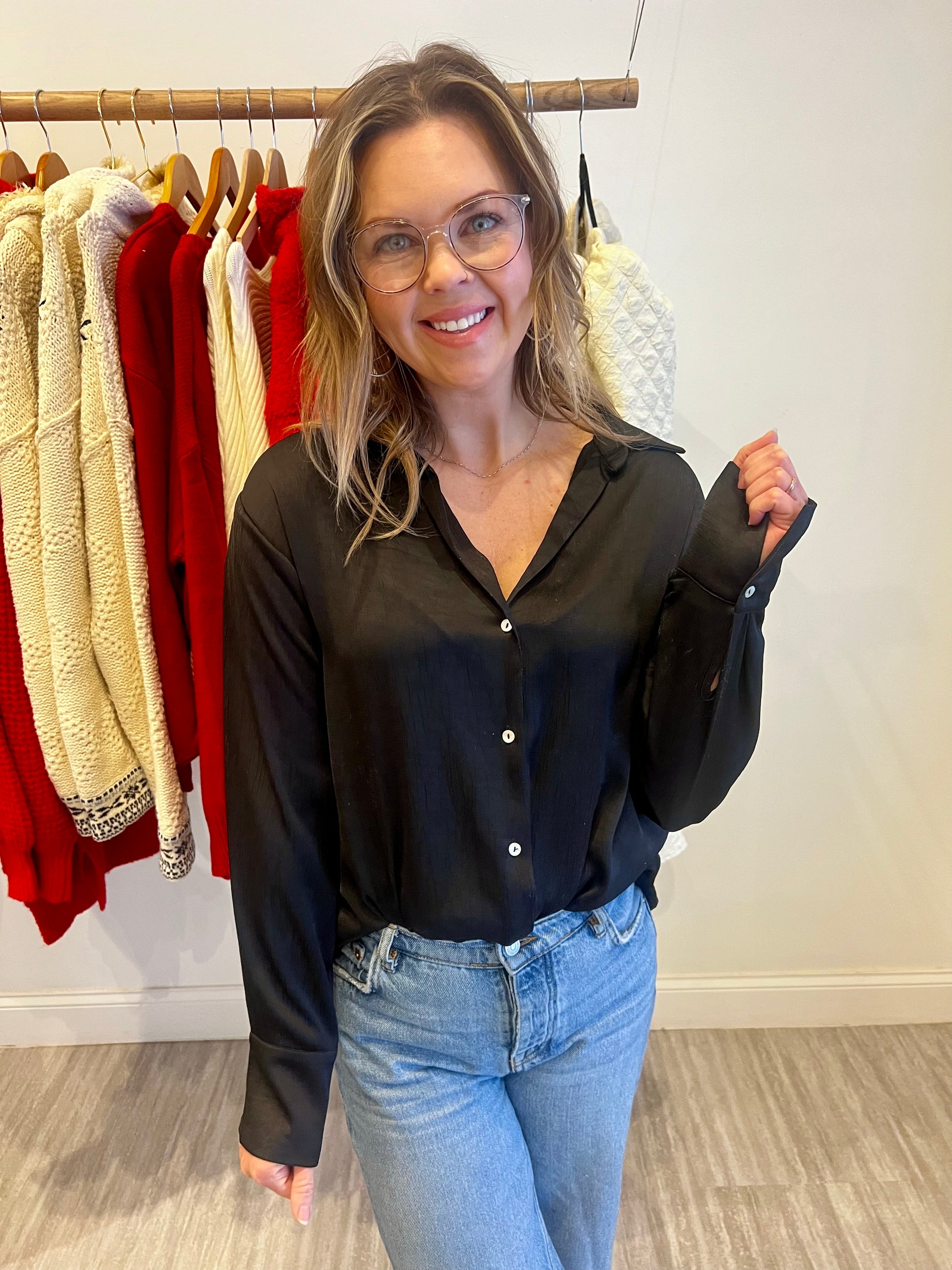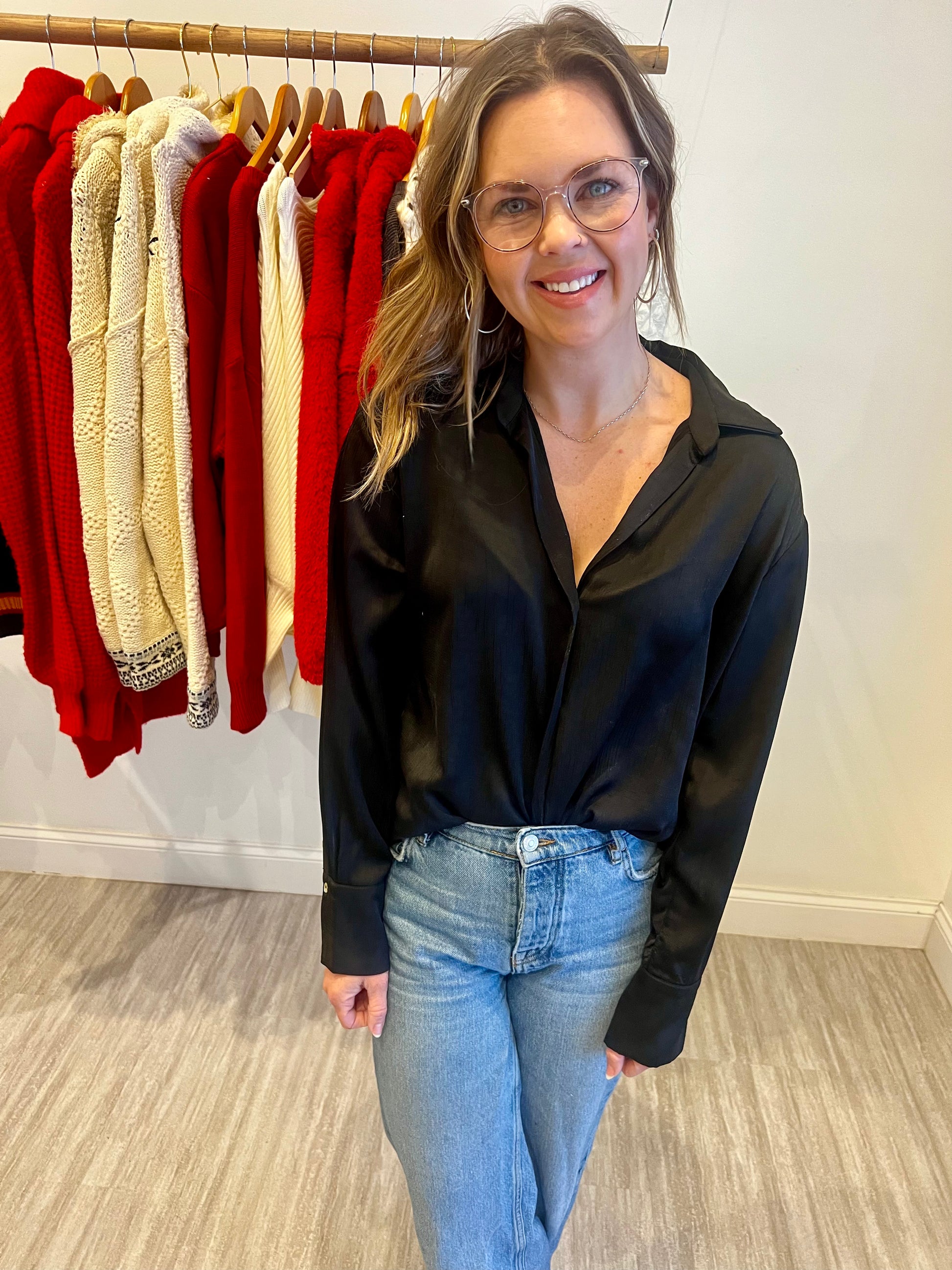 Revamp your wardrobe with our Satin Black Statement! This versatile button-up is perfect for dressing up any occasion. The satin black fabric adds a touch of luxury, making it a great dressy option for any event. Elevate your style and feel confident in this must-have piece.