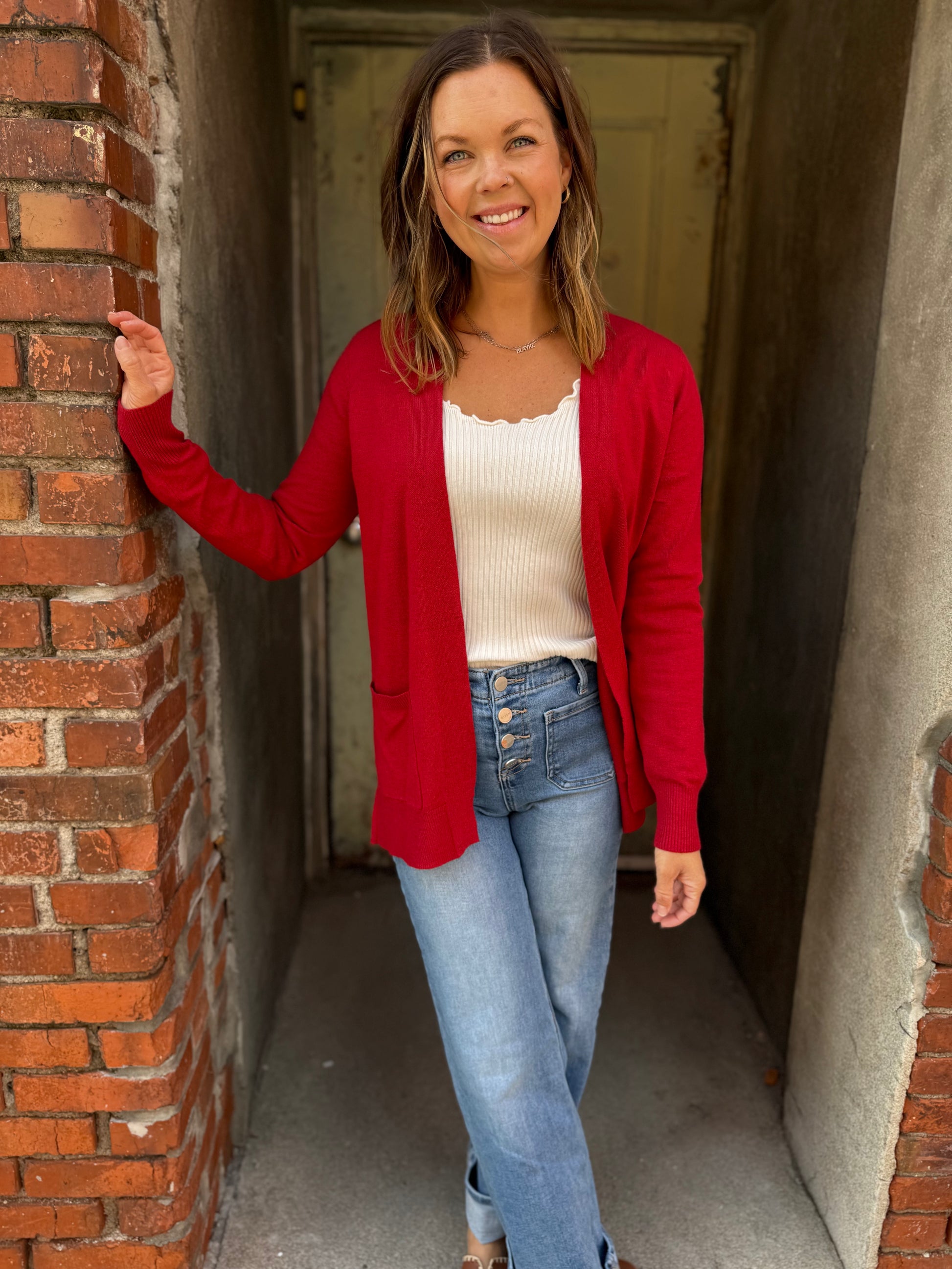 Wrap yourself in timeless comfort with our Cherry Comfort Cardigan. This open-front, long sleeve sweater cardigan is a closet essential—designed for everyday ease and effortless layering. Featuring functional front pockets and a flattering relaxed fit, its rich red hue adds a bold pop to any look. Whether you’re headed to work, lounging at home, or layering up for a crisp day out, this cardigan brings cozy charm to every occasion.