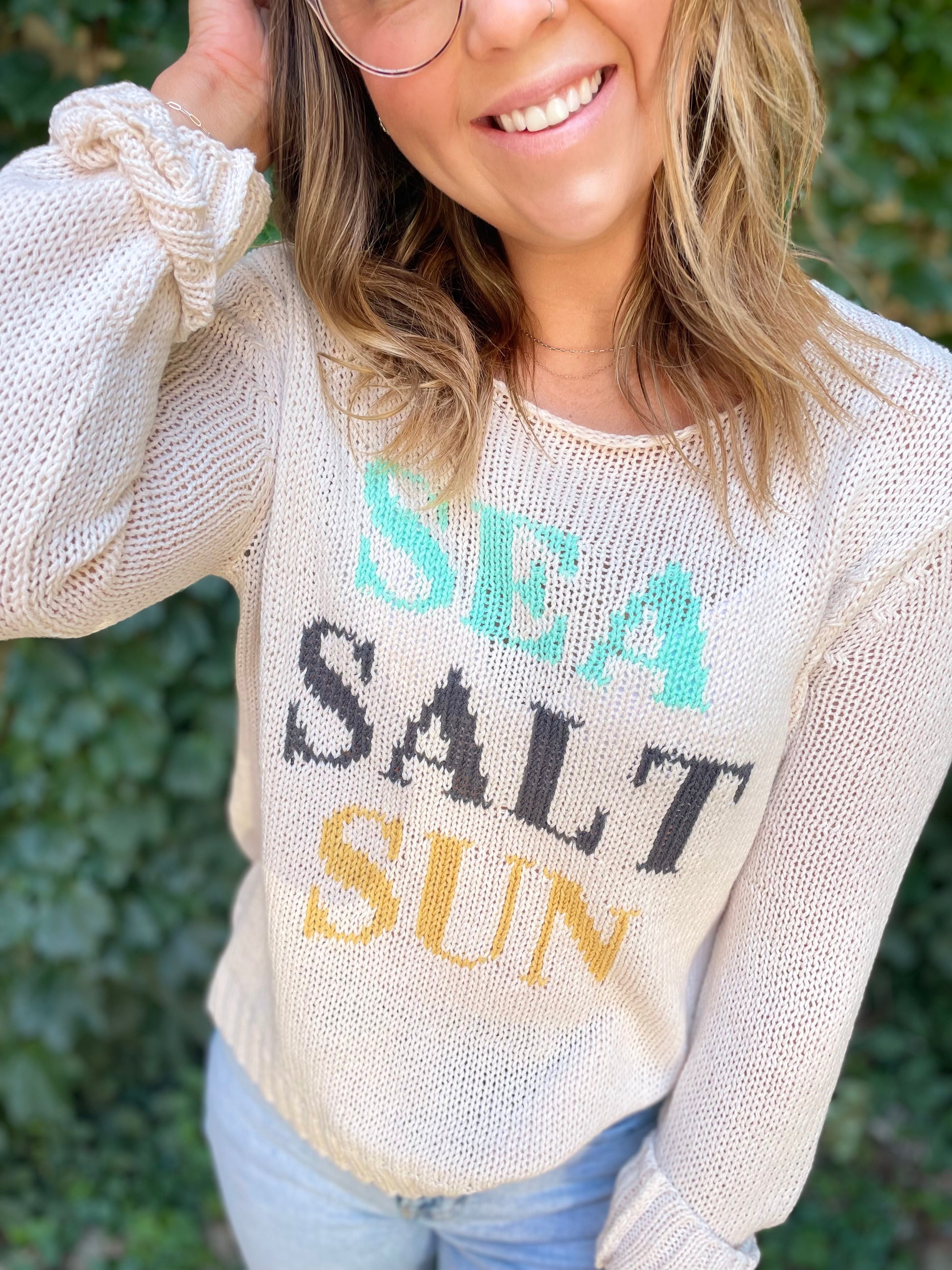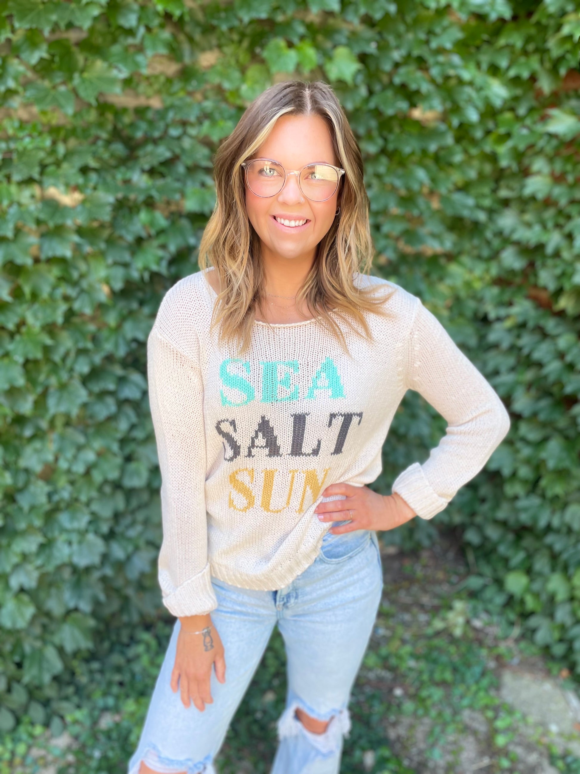 Sea, Salt, Sun - the best things about the beach all in one sweater. Drape yourself in this soft, airy and lightweight knit. The fit is boxy and the sleeves are knit extra long for a laidback vibe. The single stich, open neckline keeps you feeling cool. Details include non-binding ribbing on the hem and cuffs.