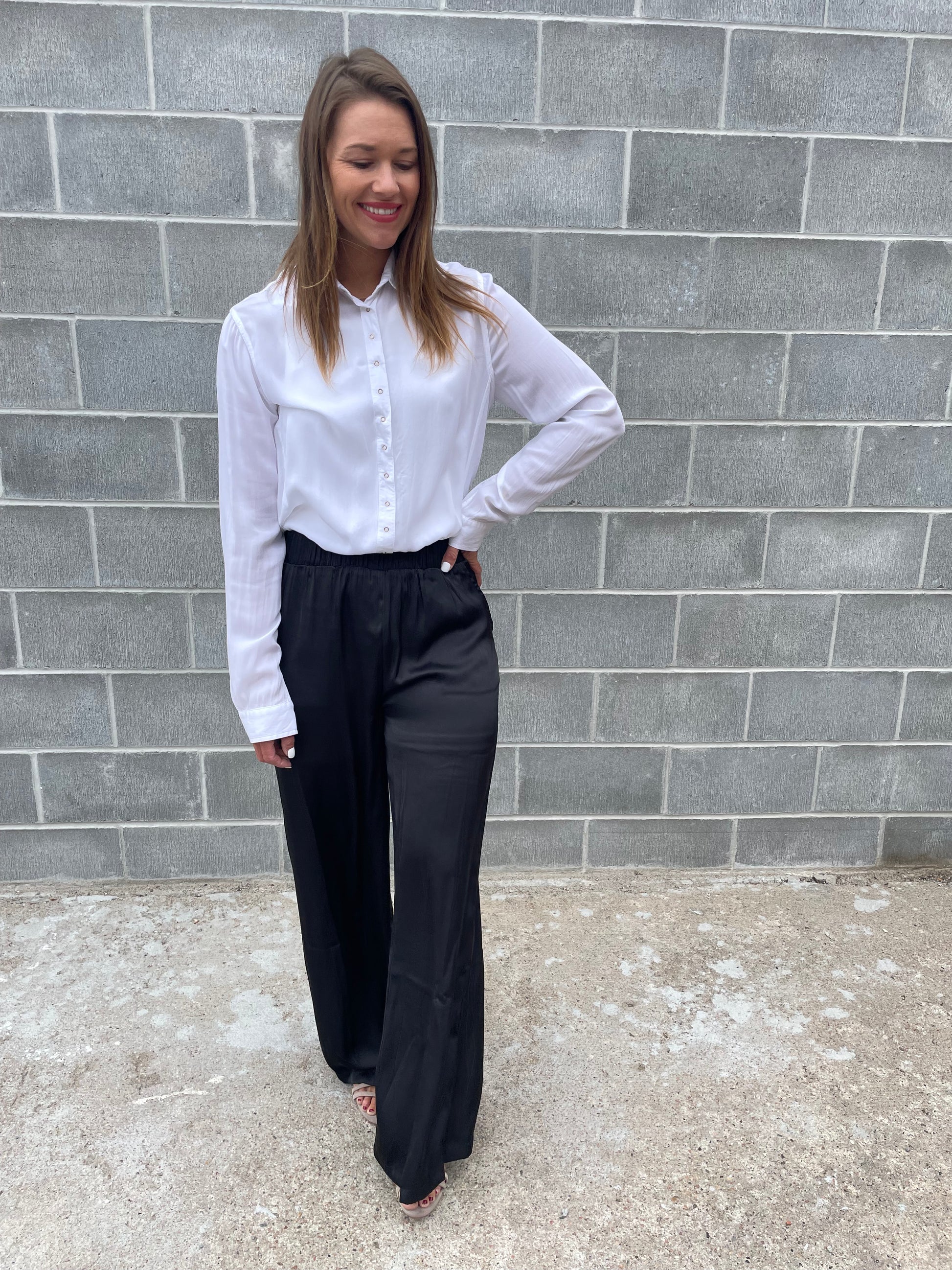 These Silky Wide Leg Pants in Black are a must-have for any formal occasion. With a woven high rise and elastic band, they offer both style and comfort. The wide leg detail and side pockets add functionality, while the silky fabric adds a touch of elegance. Perfect for any formal attire.