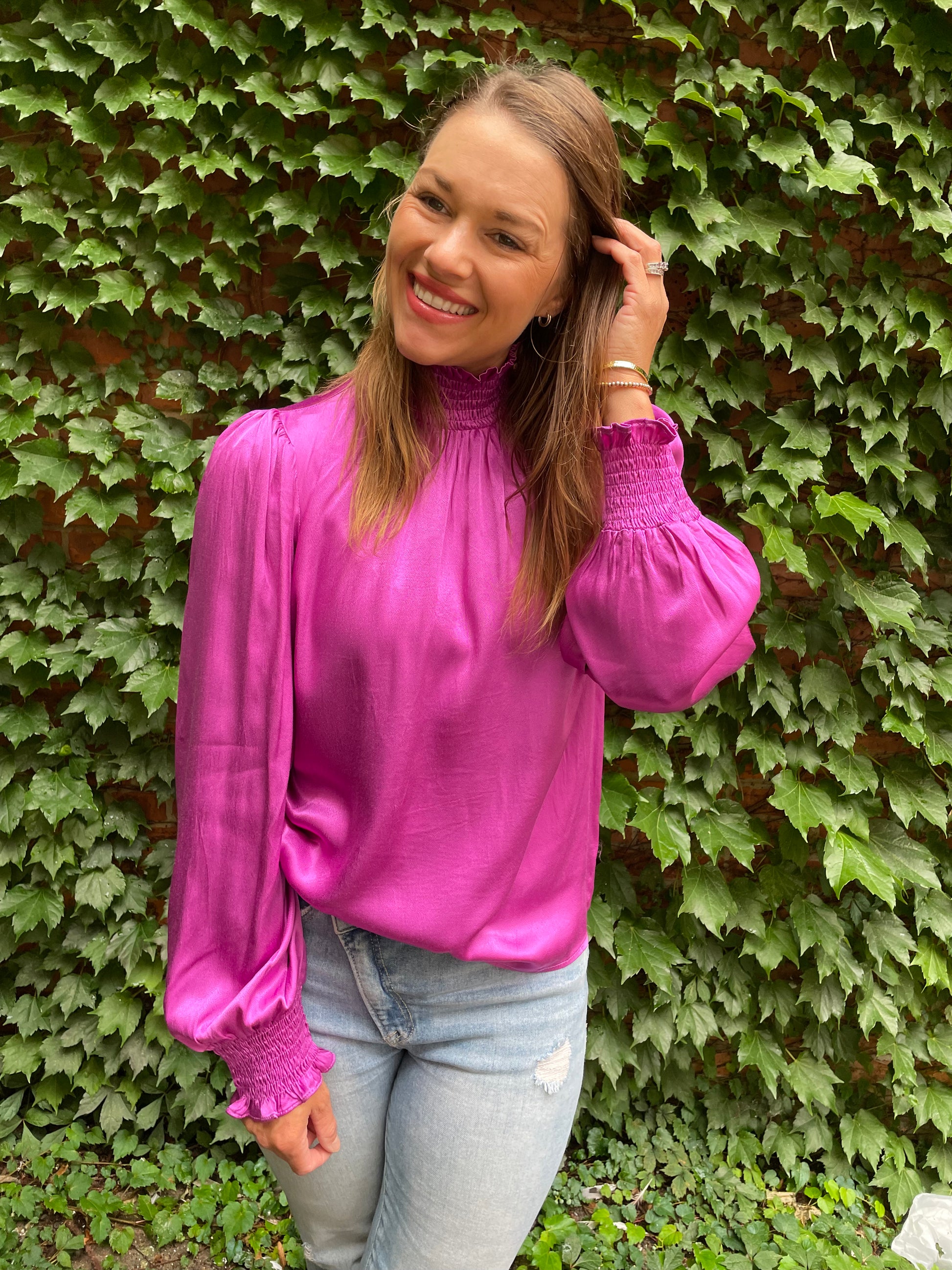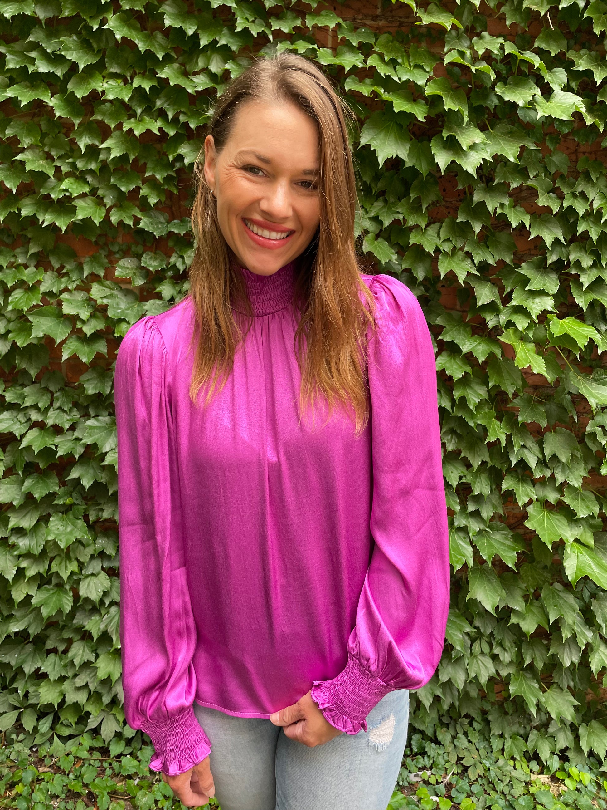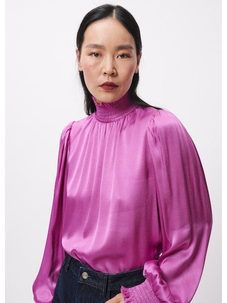 Get ready to turn heads in the Violet Satin FRNCH top. With its beautiful satin fabric and stunning color, it's a high-quality piece that will upgrade your work wear game. The high neck and wrist and neck detail add a touch of elegance. (Great brand, great work wear option!)